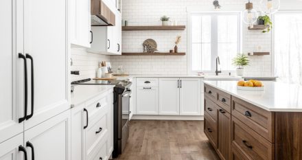 Vous cherchez à ajouter de la chaleur et de la texture à votre cuisine toute blanche? Pensez à introduire des armoires de bois naturel et de matériaux sophistiqués offrant des textures agencées. Le contraste des matériaux ajoute de la profondeur et du caractère à l’espace, tout en conservant la simplicité et la propreté d’un schéma de couleurs blanches.