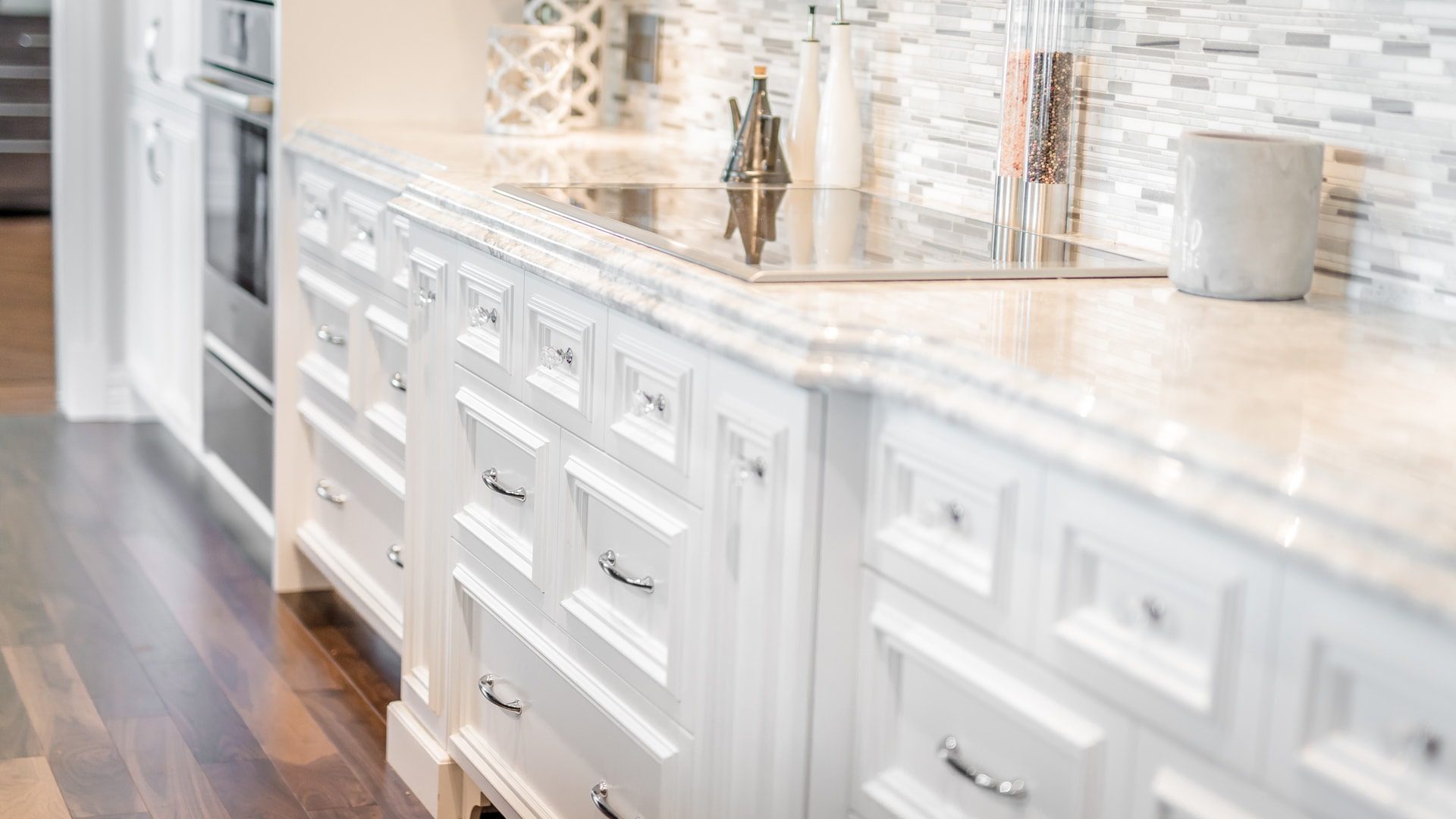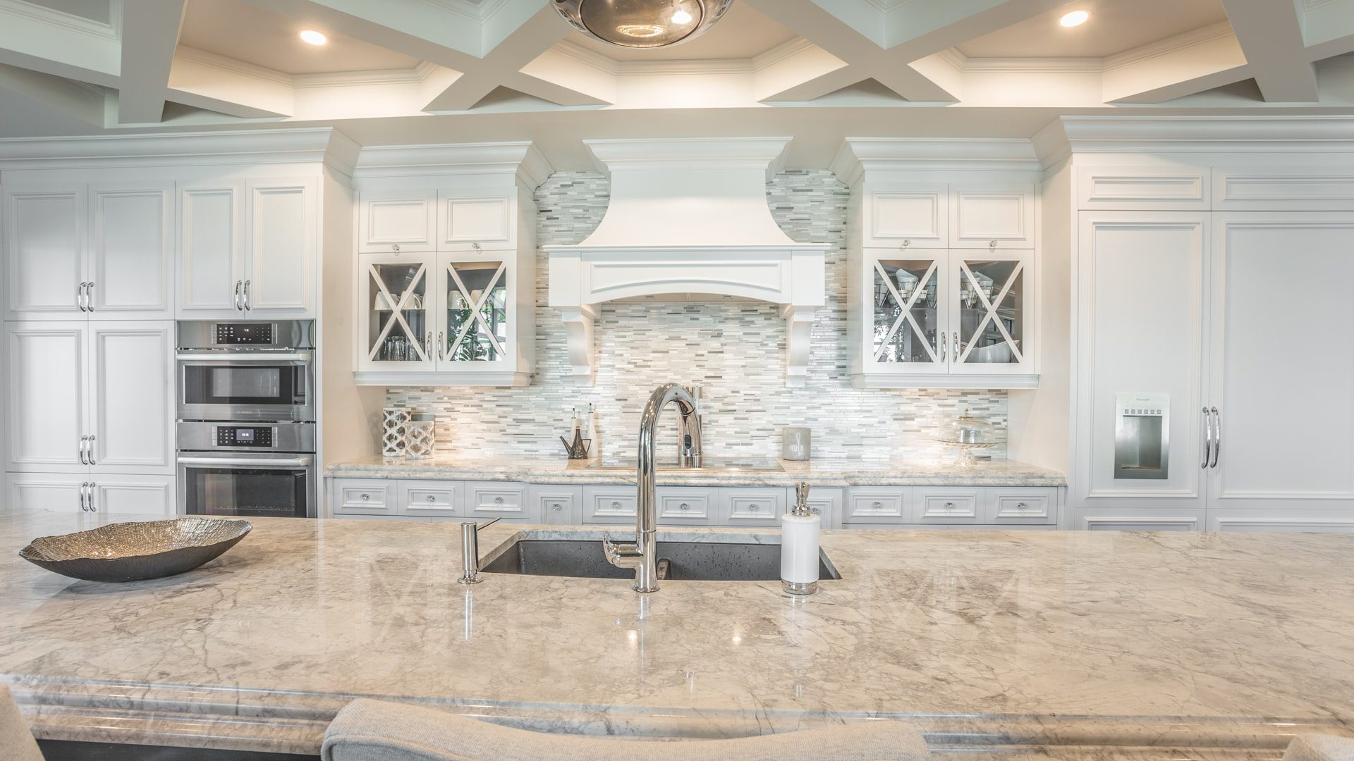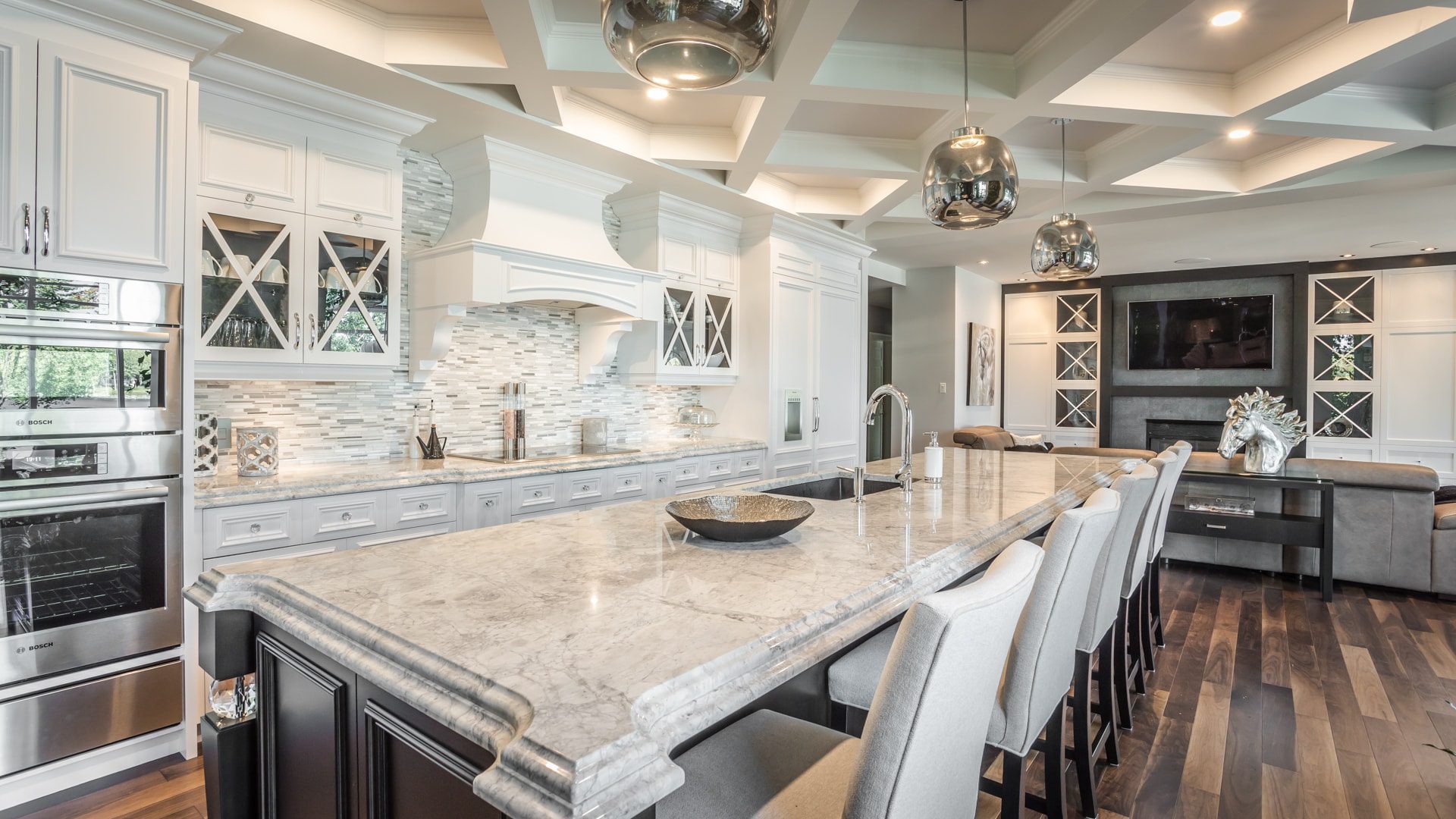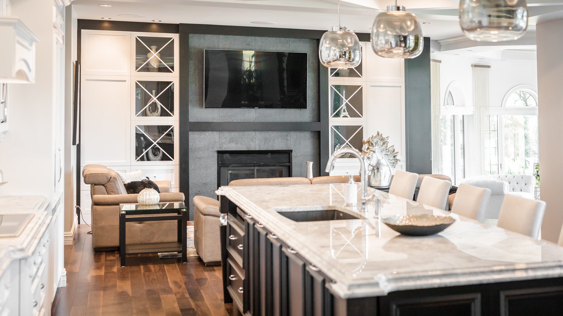 Bien que le blanc soit à l’honneur dans cet espace, nous adorons le contraste des armoires de l’îlot et du meuble intégré en merisier teint noir. Notons l'ajout de décorations en cristal sur les pieds de l'îlot pour un effet majestueux.