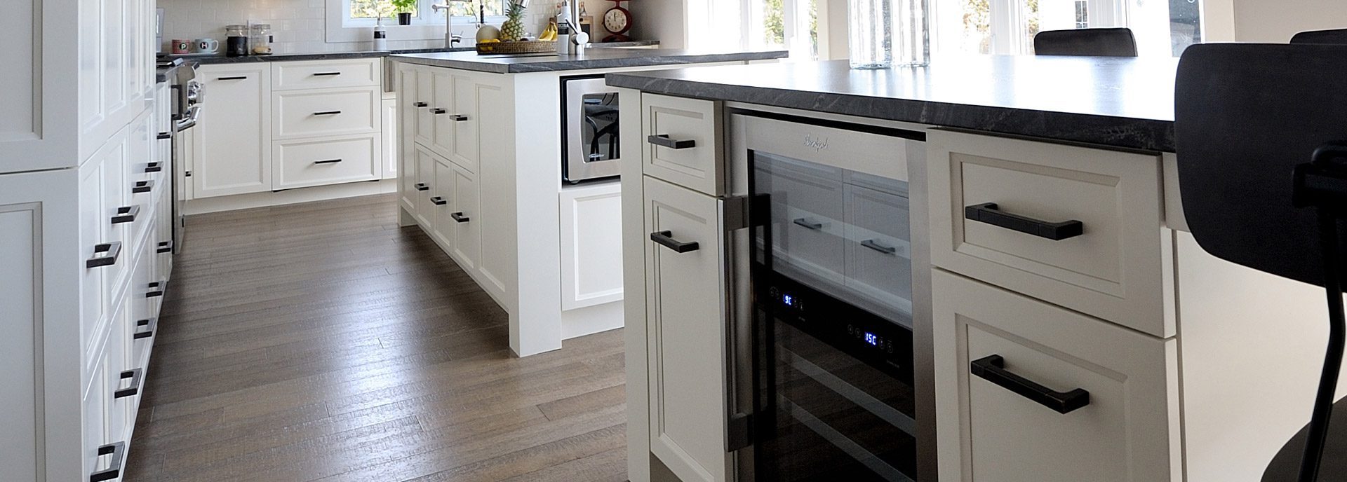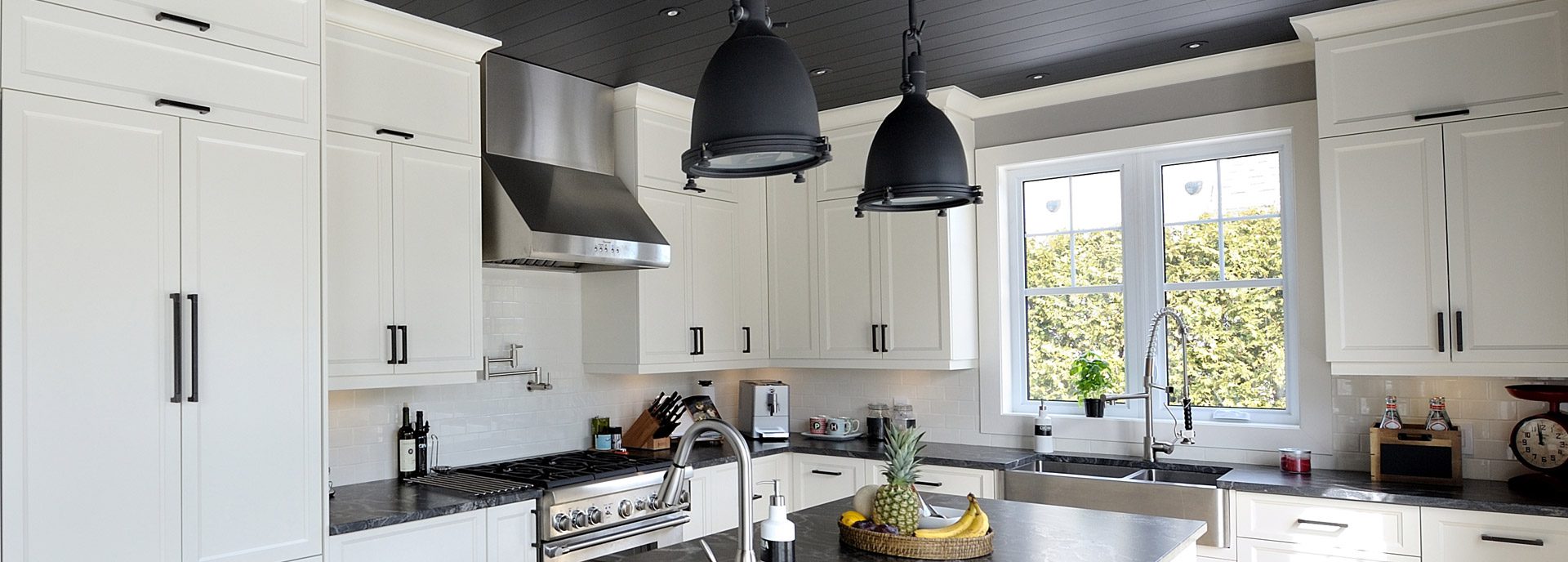 Cette élégante cuisine en noir et blanc à l'allure classique présente des lignes droites et sobres. L'ensemble arbore un style minimaliste et épuré qui saura passer l'épreuve du temps.
