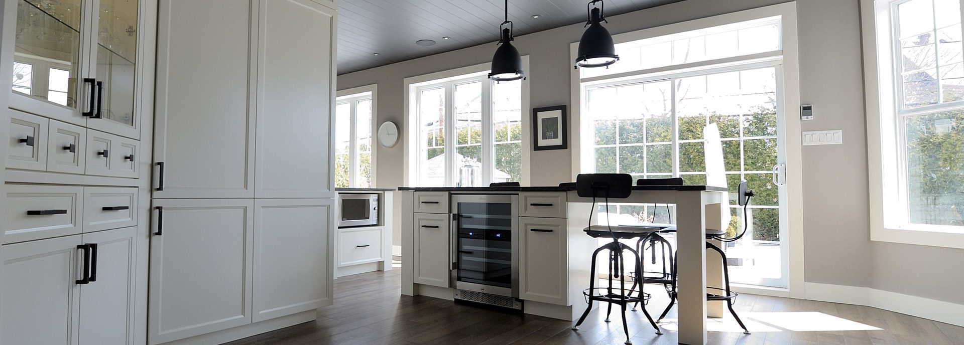 Les armoires de cuisine sont faites de MDF laqué qui reflètent magnifiquement la lumière, donnant à la pièce une atmosphère reposante empreinte de pureté. Le comptoir de marbre dépoli est à la fois chic et discret, formant un bel équilibre avec le reste du décor.