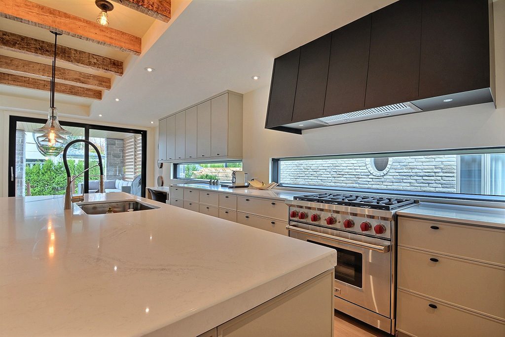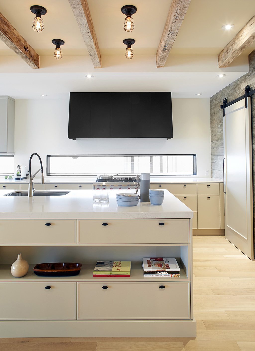 Fonctionnelle et ergonomique, cette cuisine au design épuré est un mariage heureux d’éléments rustiques et d’éléments plus modernes. Les revêtements muraux en bois ainsi qu’une porte coulissante sur rail d’acier noir dissimulant le garde-manger contrastent avec les matériaux au look plus moderne comme les armoires en MDF laqué ou le comptoir en quartz, pour un effet au goût du jour.
