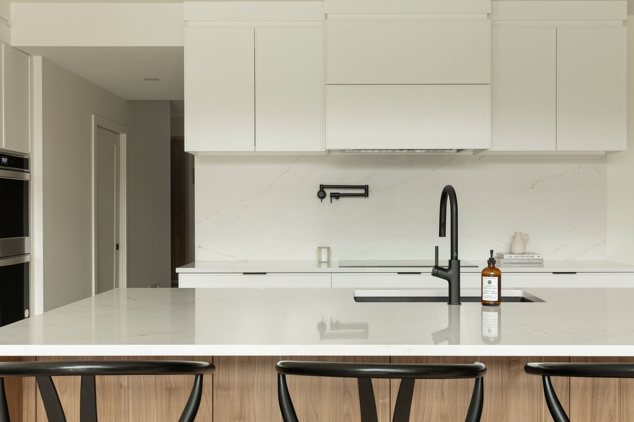 En contraste, les armoires blanches au fini mat imposent leur simplicité, tel un calme visuel qui apaise l’ensemble. Cette rencontre entre des textures organiques et des surfaces épurées crée une ambiance scandinave réinventée, où la lumière s’épanouit, changeant au gré des heures. Une dualité qui ne cherche pas à trancher, mais à coexister — transformant la cuisine en un espace équilibré, moderne et profondément habité.