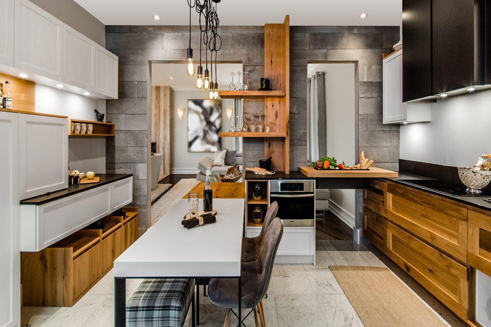 Un grand souci du détail a été accordé dans la conception de cette cuisine élégante et chic, d’inspiration européenne. Les lignes simples, l’utilisation de matériaux purs et bruts, le jeu d’asymétrie offrent un résultat de style rustique chic, qui se démarque par son originalité et par son raffinement.