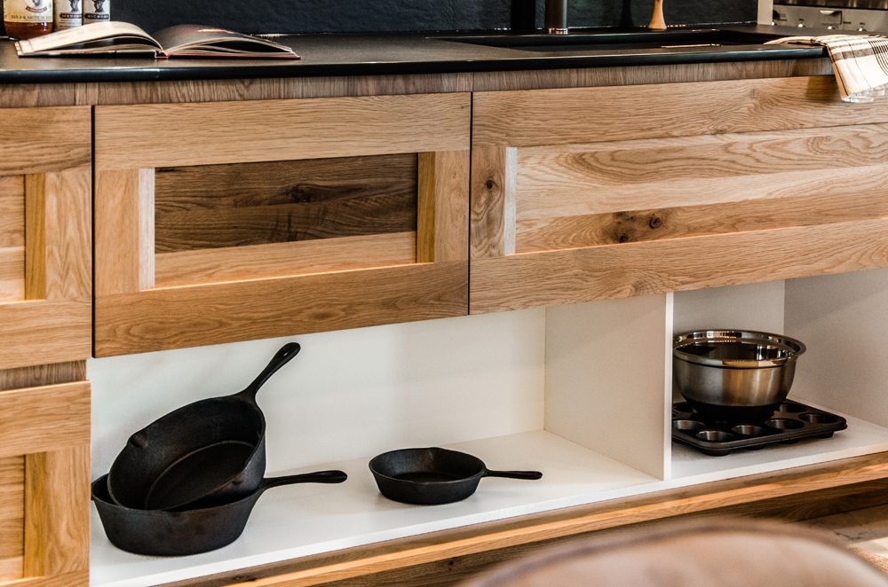 Différents styles d’armoires ont été combinés. D’une part, des armoires en chêne massif au rebord biseauté de modèle Camé, une exclusivité Tendances Concept, ajoutent rusticité et chaleur grâce à leur fini brut. D’autre part, des armoires shaker en laque couleur neige créent un effet sobre et épuré. Les tuiles de béton recouvrant l’un des murs viennent ajouter une touche rudimentaire à ce mélange de textures et d’ambiances.