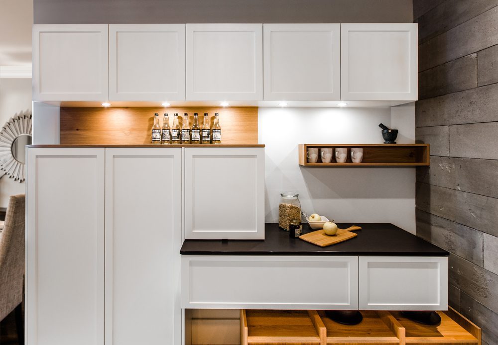 Certains outils et accessoires de cuisines tels qu’ustensiles, vaisselle et casseroles sont délibérément exposés et placés à pleine vue, pour un effet des plus conviviaux. Des luminaires ont été encastrés sous la plupart des armoires pour un maximum de fonctionnalité et de luminosité. La hotte de cuisinière a été conçue sur mesure et un coin déjeuner a été dissimulé derrière une porte rétractable.