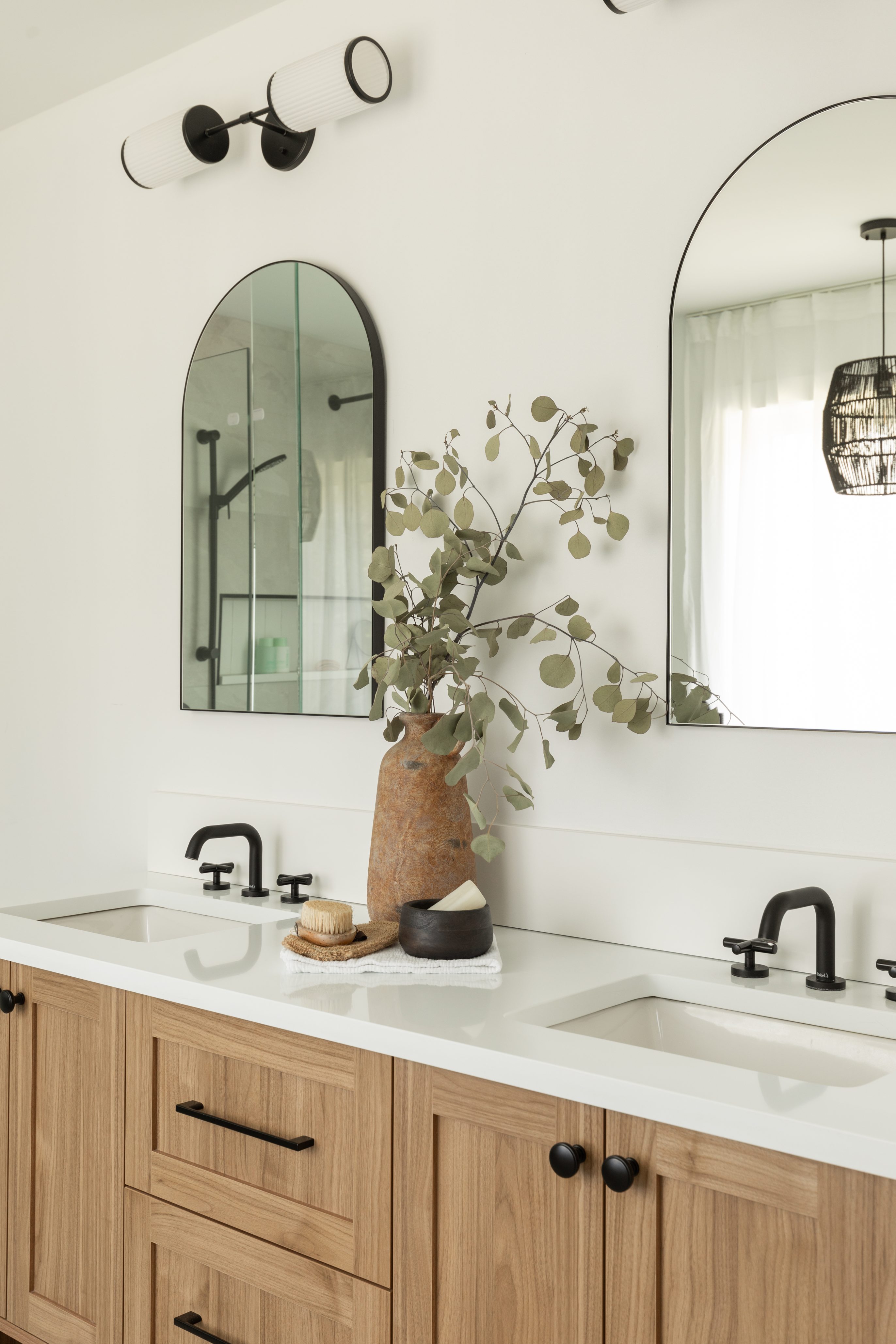 Cette magnifique salle de bain allie le style rustique du Farmhouse au design moderne pour créer un espace harmonieux et accueillant. Le bois naturel et les accents noirs en acier inoxydable lui confèrent une ambiance chaleureuse et accueillante.