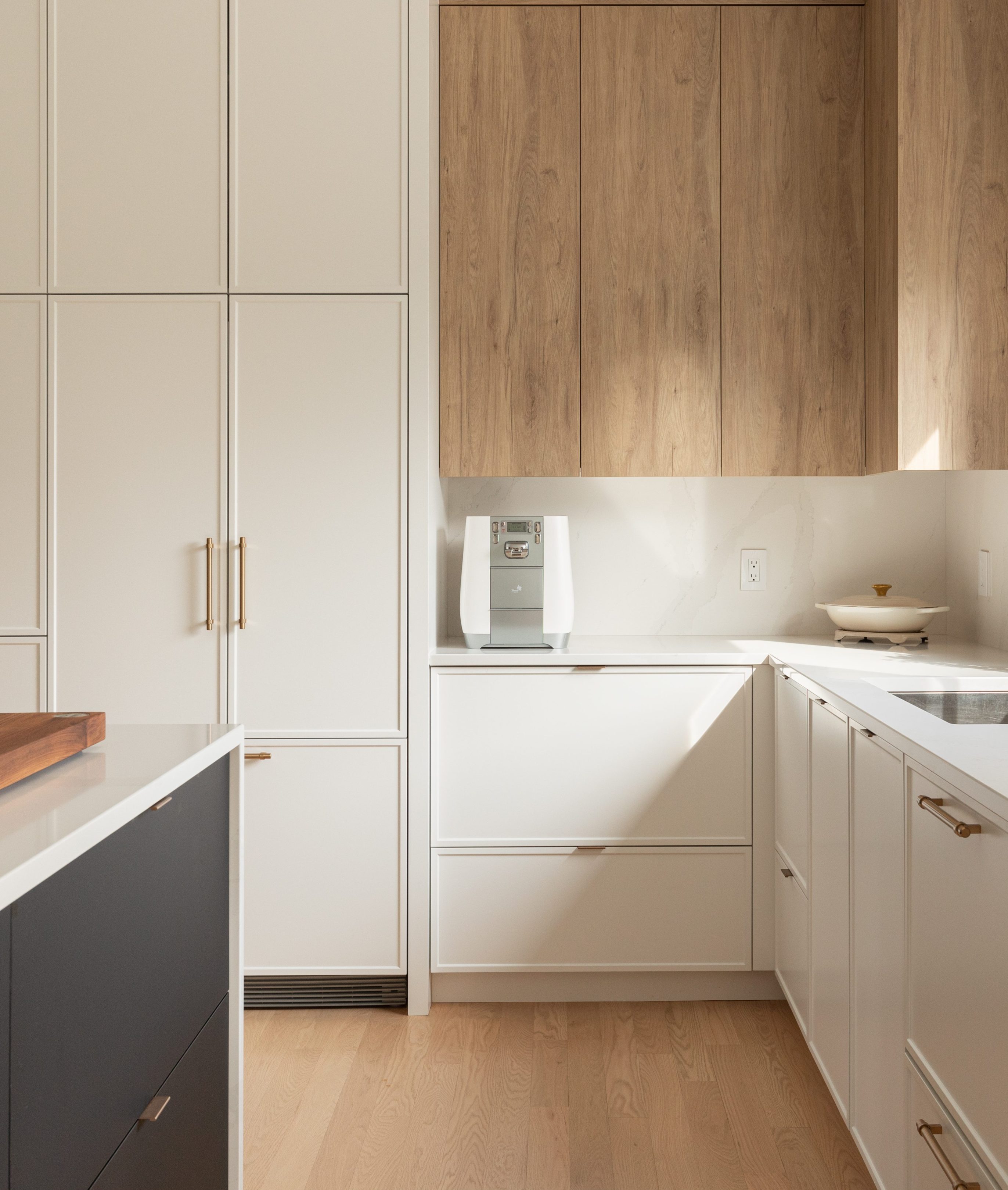 White cabinet doors from Ateliers Jacob’s Lacquer collection enhance the sense of openness by reflecting light, adding to the kitchen’s spacious feel. The European laminate collection, featuring wood textures, brings depth and character. These materials are thoughtfully applied in the barista area, breakfast nook, and upper cabinets, ensuring visual coherence throughout the space.