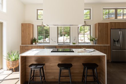 To make it easier to move around the kitchen, the designer chose to leave 4 feet of passage between the countertops instead of the standard 3 feet. A smart choice for a kitchen where meal preparations are done with the family in a fun atmosphere.