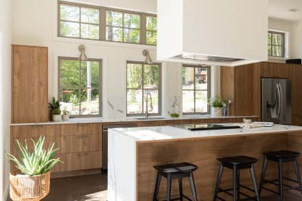 The centered sink also makes daily life easier by bringing the work surfaces closer together. Our designer chose to place the fridge near the pantry for a clear view of the open living space.
