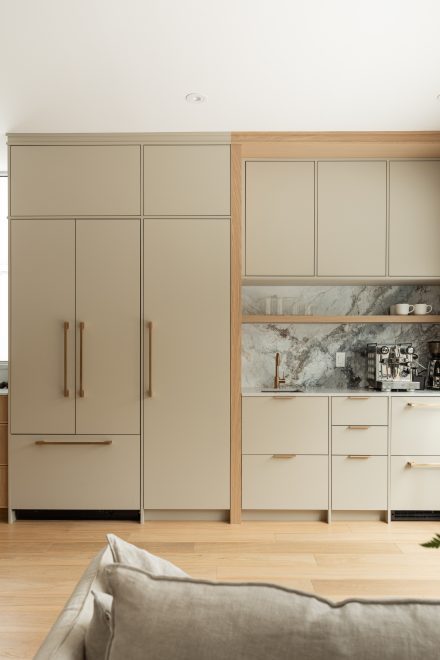 A concealed kitchen doesn’t impose itself, it speaks in subtle materials. Solid wood, natural stone, minimalist handles, integrated outlets: these chosen materials speak softly, but for a long time. Each element is designed to appeal to the eye as much as to the touch. All with a commitment to timelessness and durability. These understated yet purposeful choices transcend time and fashion, as Designer Lisa Odyniec explains: “New options in hardware and appliances allow the functionality of the kitchen to be hidden, which then becomes a backdrop for other uses.”