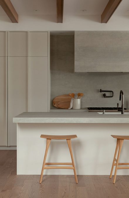The Farand kitchen harnesses this instinct through aligned cabinetry, the vertical rhythm of oak, and the steady cadence of the beams.