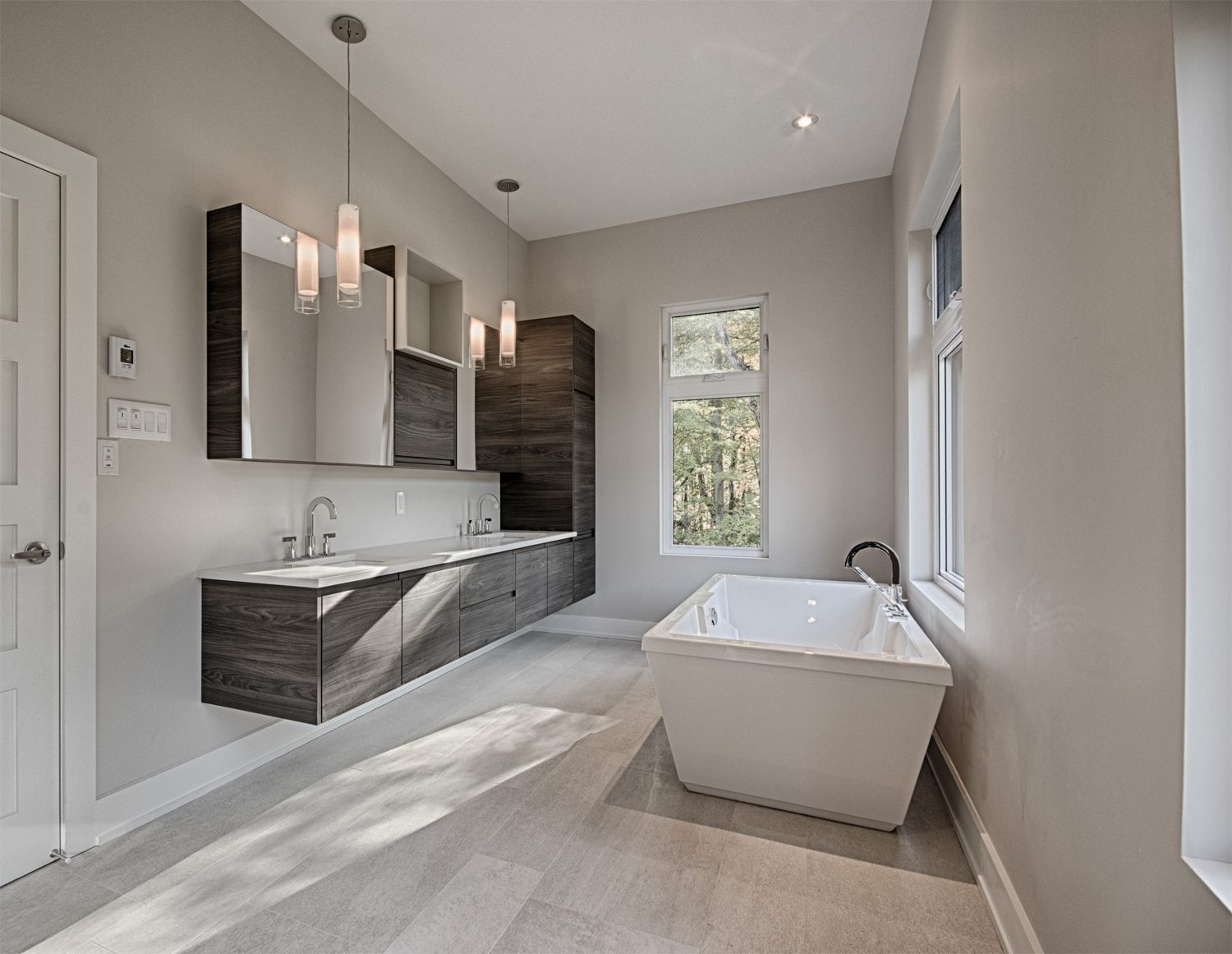 The quartz countertop, freestanding bathtub, and white lacquer niche incorporated into the cabinets bring a touch of purity and brightness to the decor. The medicine cabinet mirror conceals additional storage space, adding to the functionality of the room. The undermount sinks, built directly into the quartz countertop, are easy to clean and seamlessly blend into the overall design.