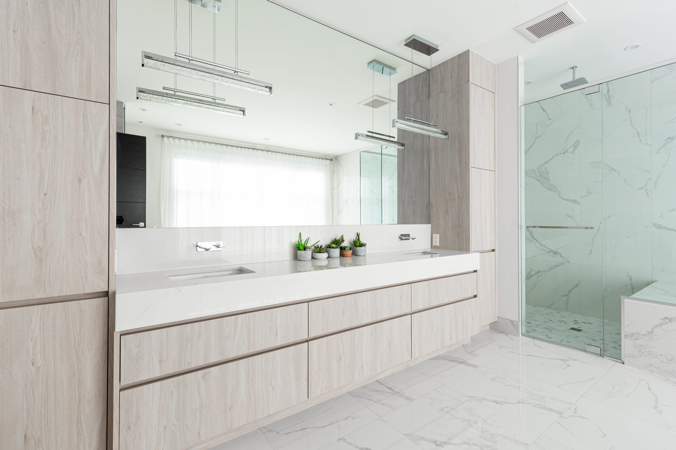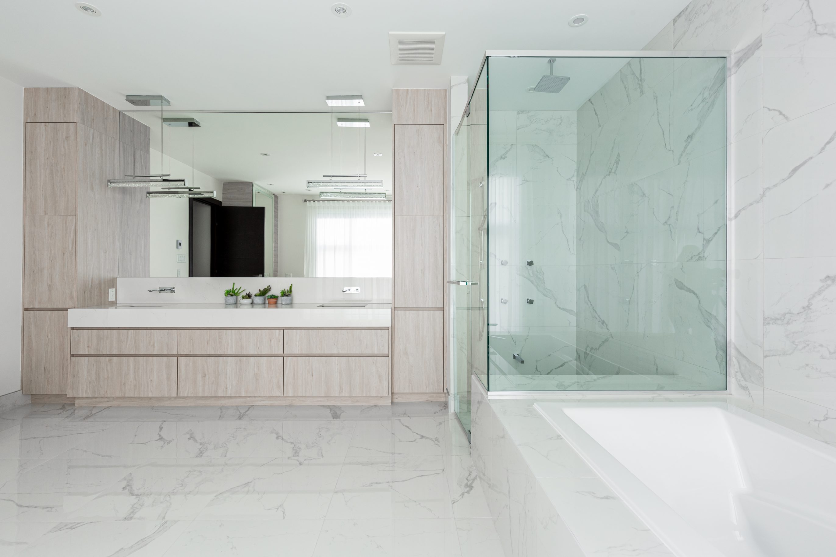 This unique master bathroom boasts a refined and luxurious atmosphere with its generous use of marble throughout. The warm tones of the cabinets perfectly complement the marble and contribute to the relaxing ambiance of the space.
