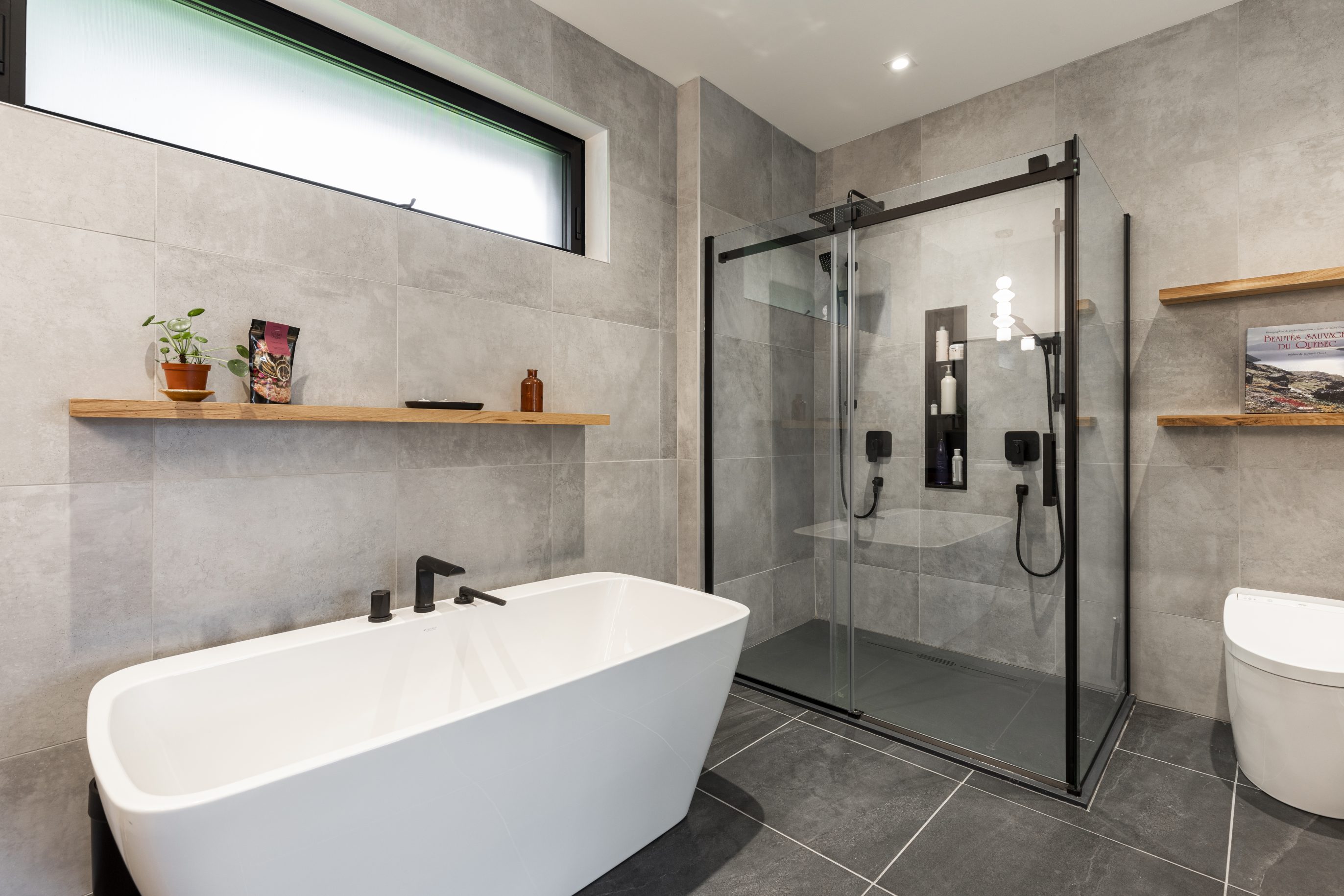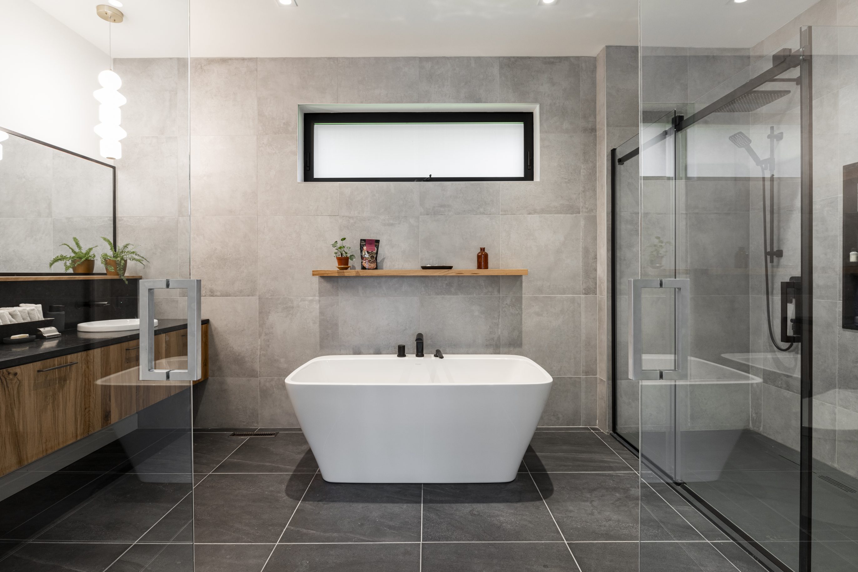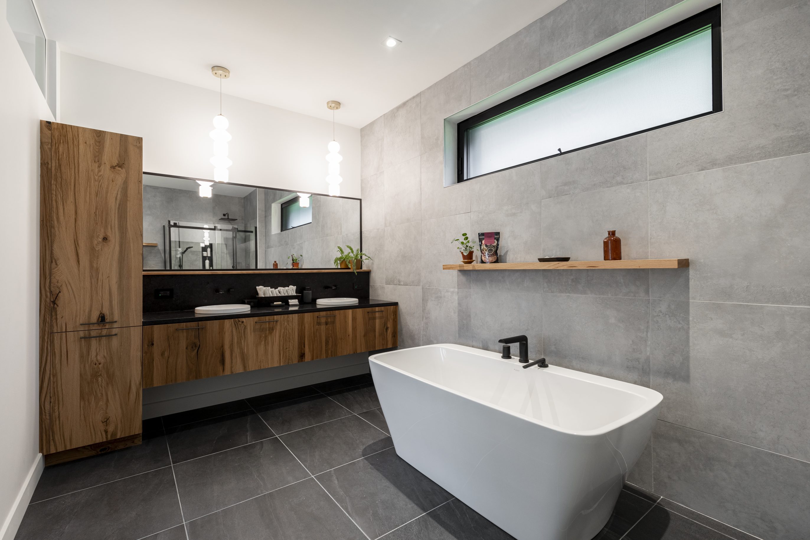 This master bathroom has a unique warm and contemporary style with a touch of organic elements that bring the space to life. The mix of natural wood elements combined with slate floors and concrete-look wall tiles give a sense of depth and texture. The floating vanity in a warm wood finish and the complementing storage cabinets are both sleek and functional, providing ample storage space without sacrificing style. Overall, this bathroom is perfect for those who seek a modern, yet organic ambiance.