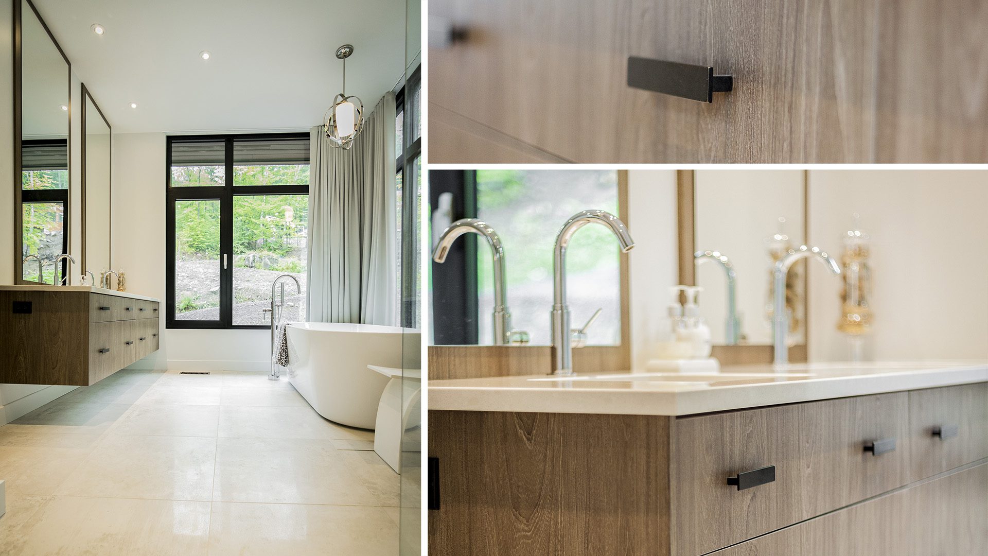 European laminate is an excellent choice due to its resistance and ease of maintenance, and the ability to print any motifs on it allows for endless customization options. In this case, we chose a light wood-colored print that brings a peaceful vibe to the room. These vanities fit seamlessly into any modern decor, especially when paired with quartz countertops in the master bathroom and Euro-laminate countertops with the same printed texture in the powder room.