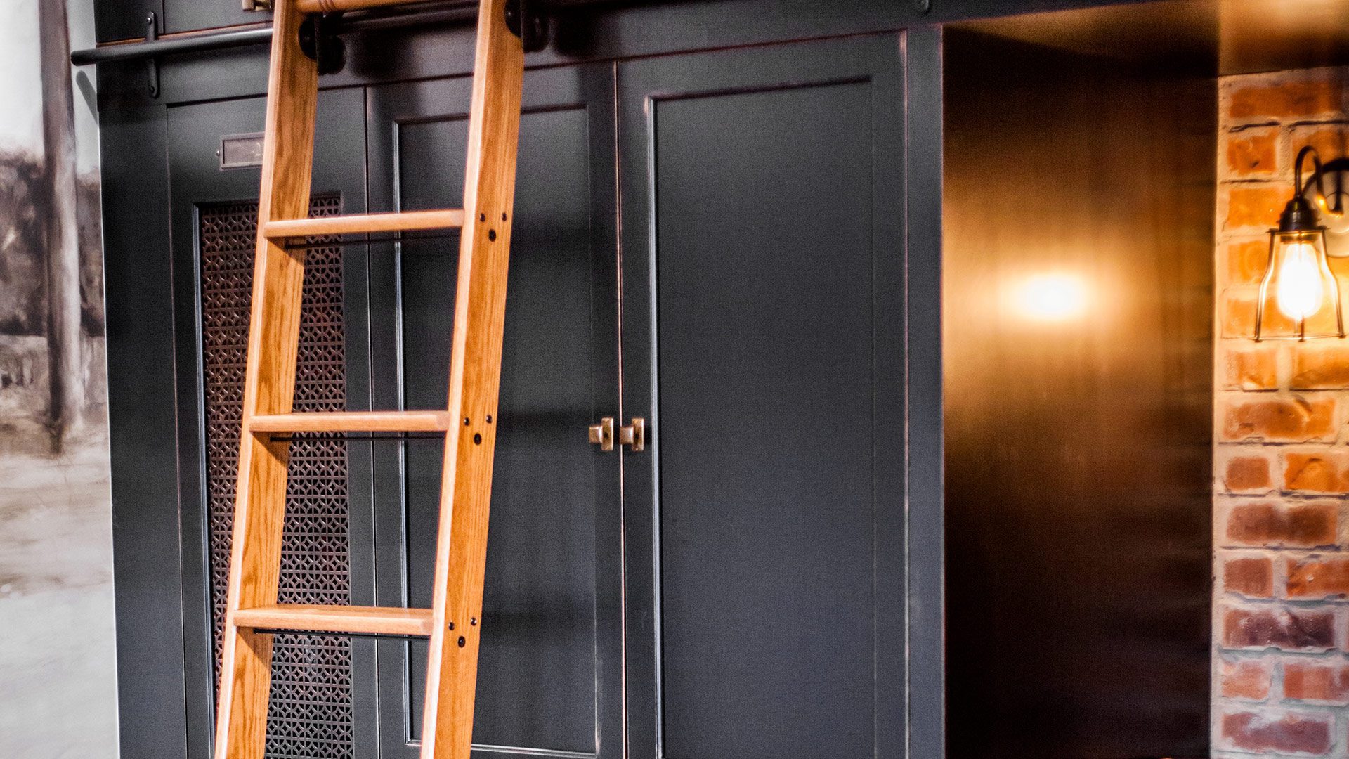 The integrated ladder allows for easy access to the upper cabinets while the wood-finish, ceramic floor allows for easy cleaning. The ladder is made of the same wood as the countertop.