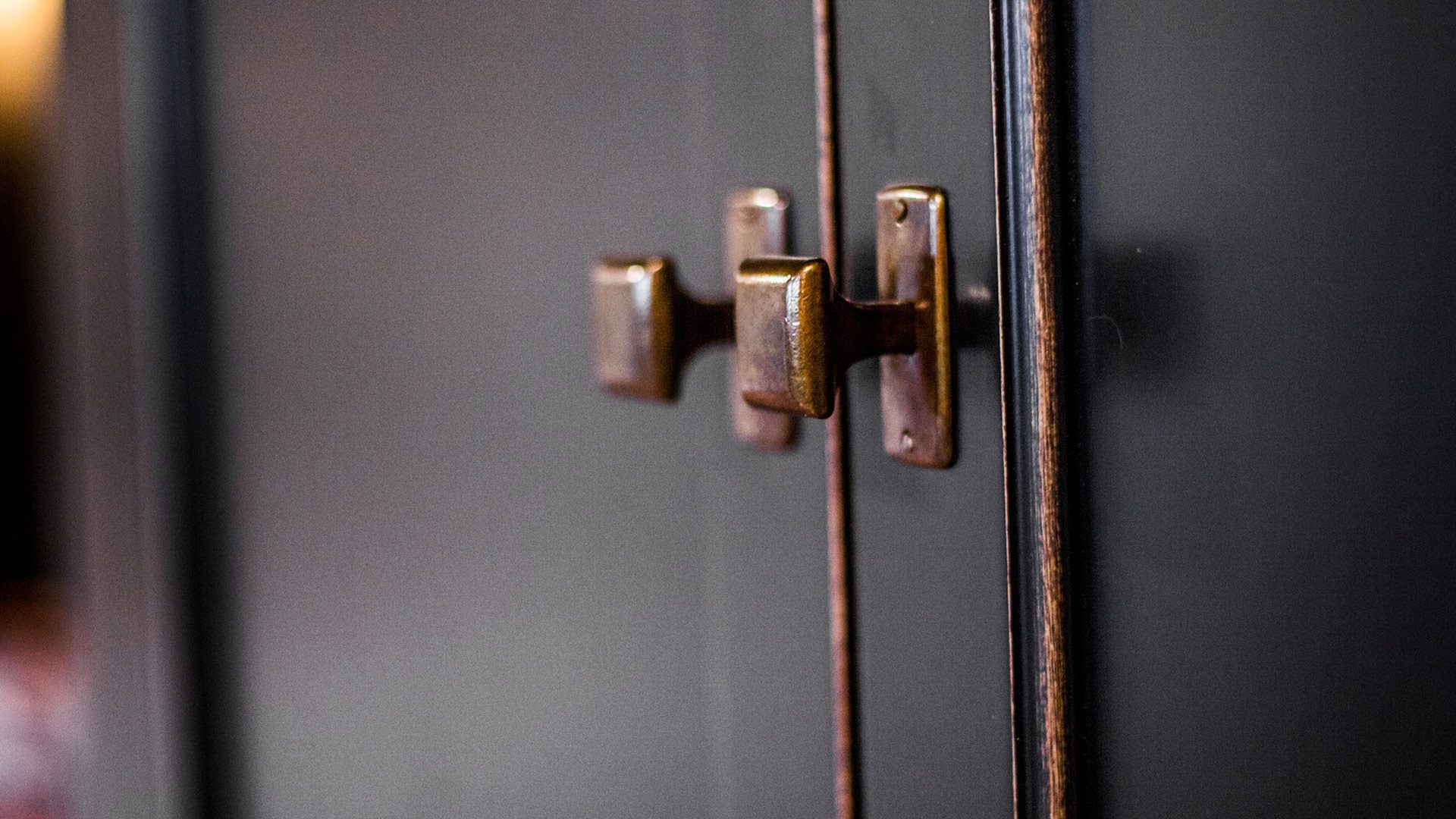Made of black lacquered birch cabinets with brass-finish handles, this garage's storage area is splendid in both look and functionality.
