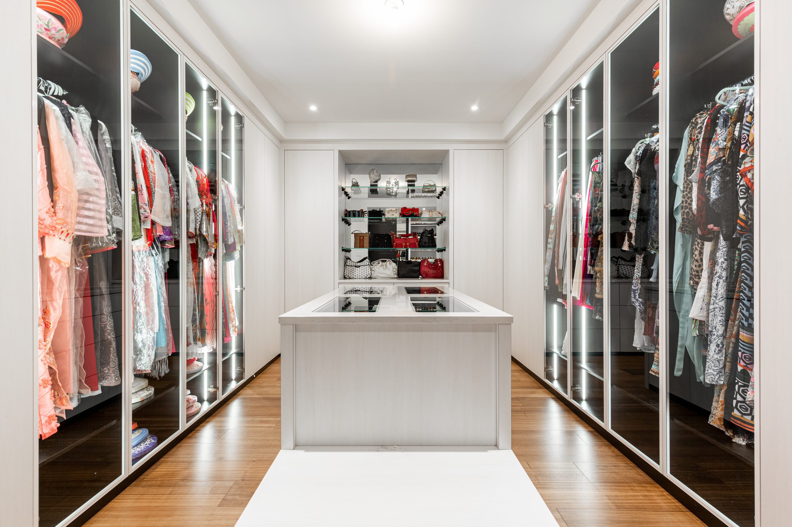 This serene and minimalist white walk-in closet creates a peaceful atmosphere, allowing you to effortlessly choose your outfit for the day and start your day on the right foot. With ample space and customizable options, this walk-in closet will become your personal sanctuary.