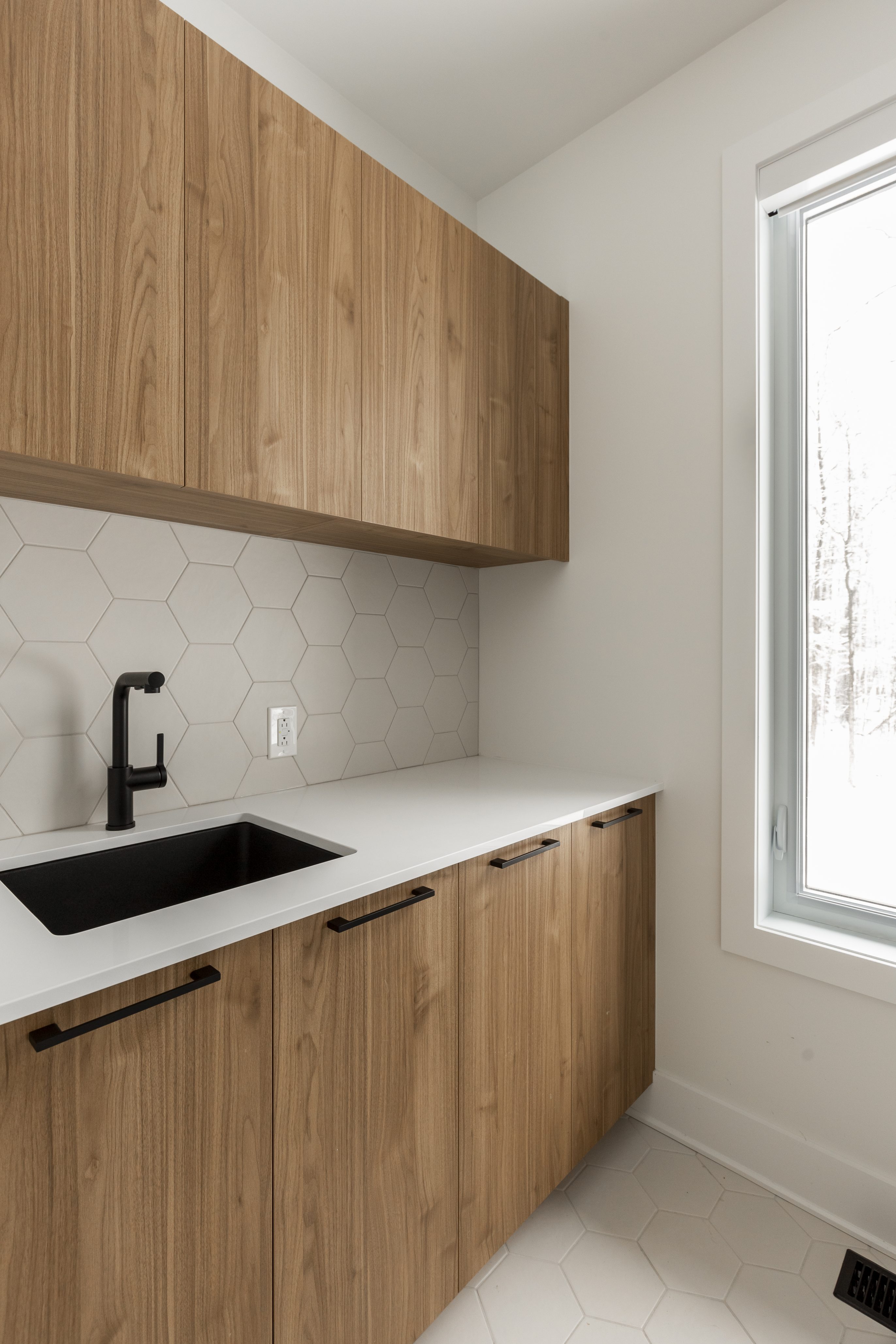 The warm and cozy atmosphere of this laundry room invites us to enjoy the simple pleasure of folding laundry. The carefully chosen white octagonal tiles seamlessly complement the room’s style, resulting in a harmonious and inviting space.