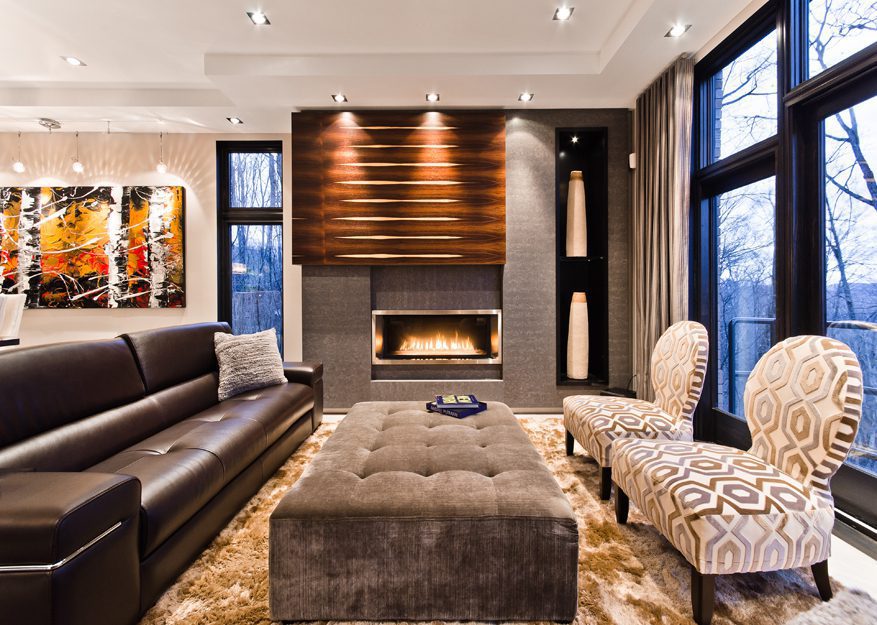 The exotic wood panel used in this design features a stunning natural pattern that resembles a work of art. The wood’s natural beauty is showcased on a wall unit that includes half-inch thick stone slabs, a built-in gas fireplace, and a black lacquer shelf, creating a striking and luxurious effect.