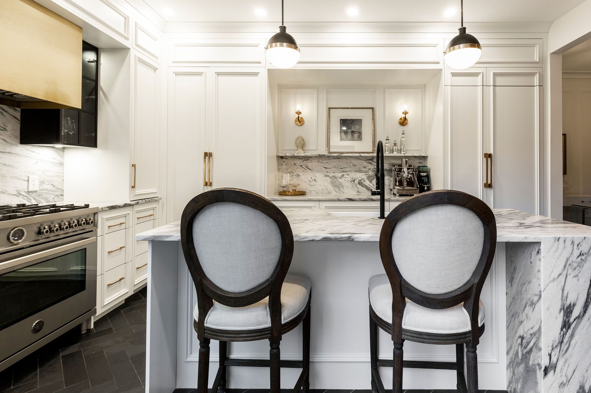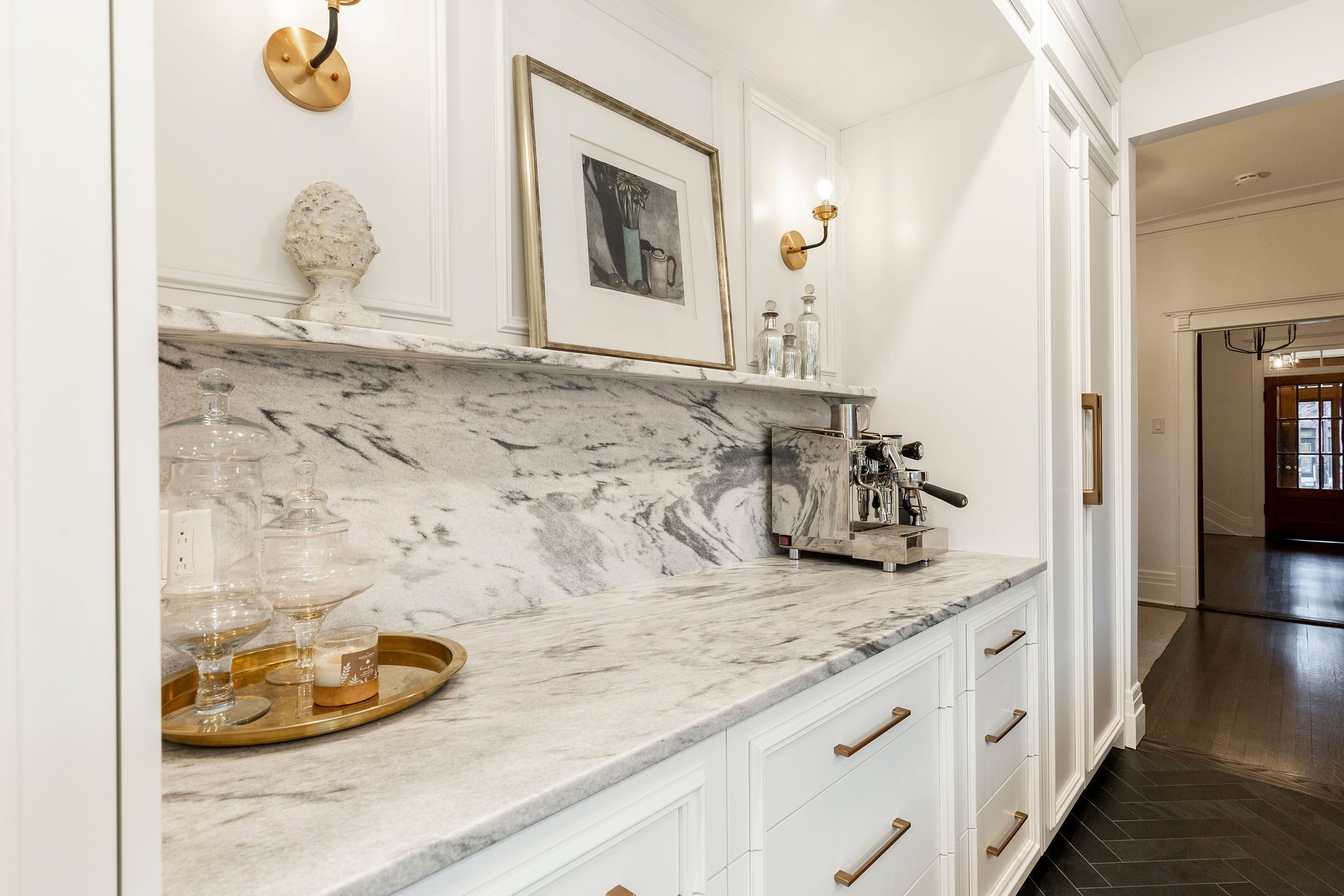 The choice of materials gives this space a classic yet edgy look with the marble countertop and backsplash full of character! We love the continuous molding on the drawers as well as the molding on the wall, the high stone backsplash with its small shelf and the brass wall fixtures.