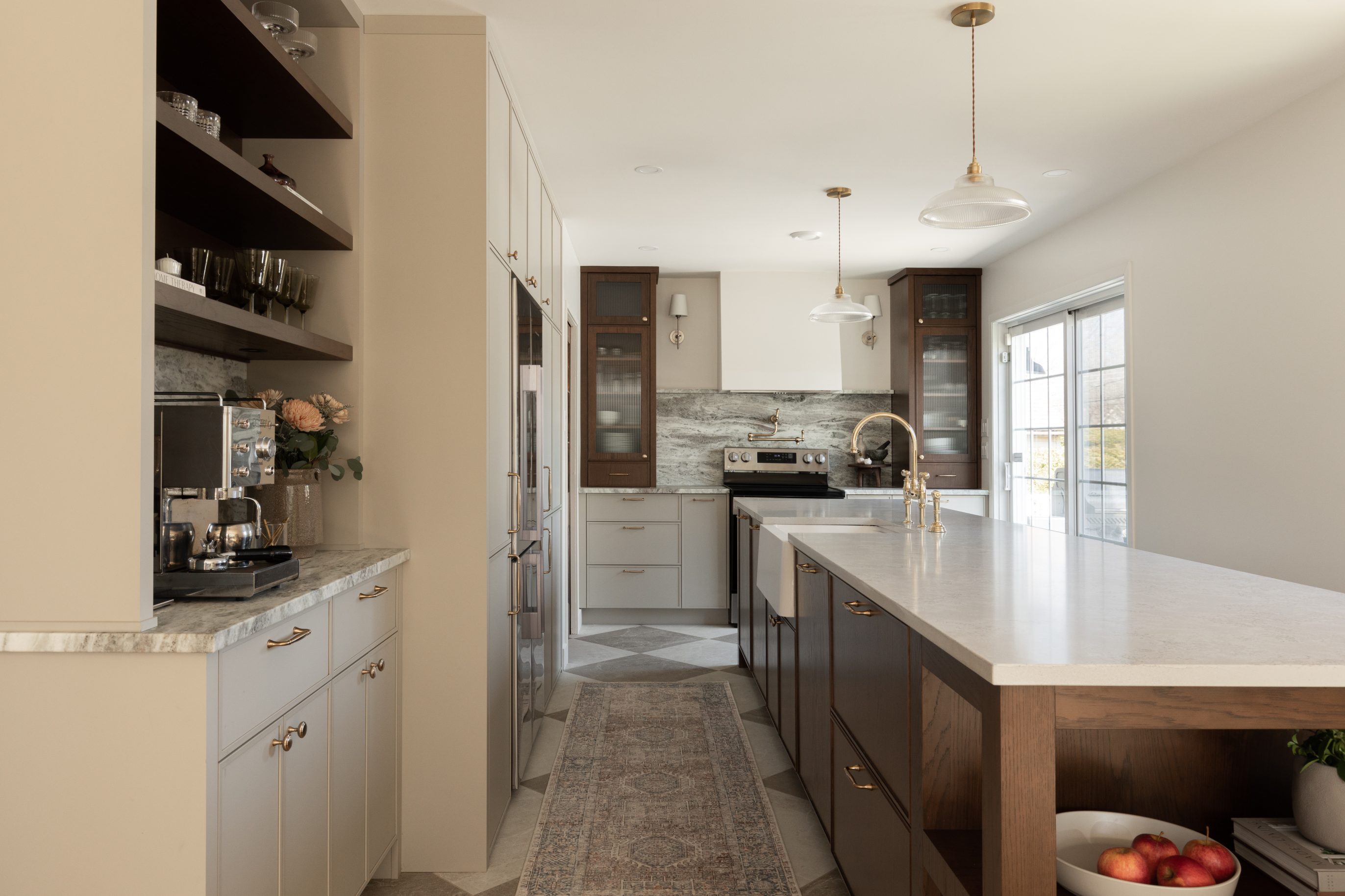 Deep-toned, rich wood from our collection is used for some of the cabinets, the island and the wall shelves in the barista area, contrasting beautifully with the lighter grey lacquer of the lower cabinets. This combination of materials, enhanced by magnificent brass handles, echoes the craftsmanship of classic English furniture.