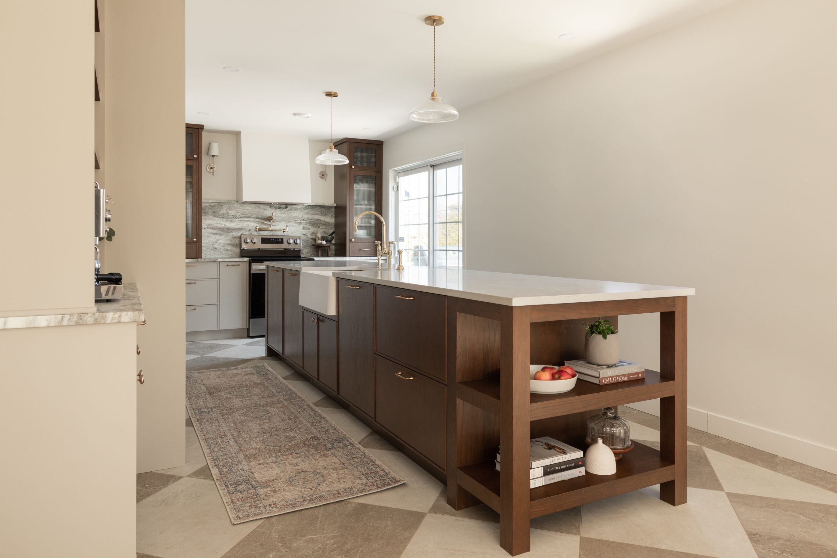This magnificent kitchen marries traditional design with modern finesse. The choice of materials in this kitchen is both thoughtful and aesthetically pleasing. The custom cabinetry uses a variety of materials from our collection.
