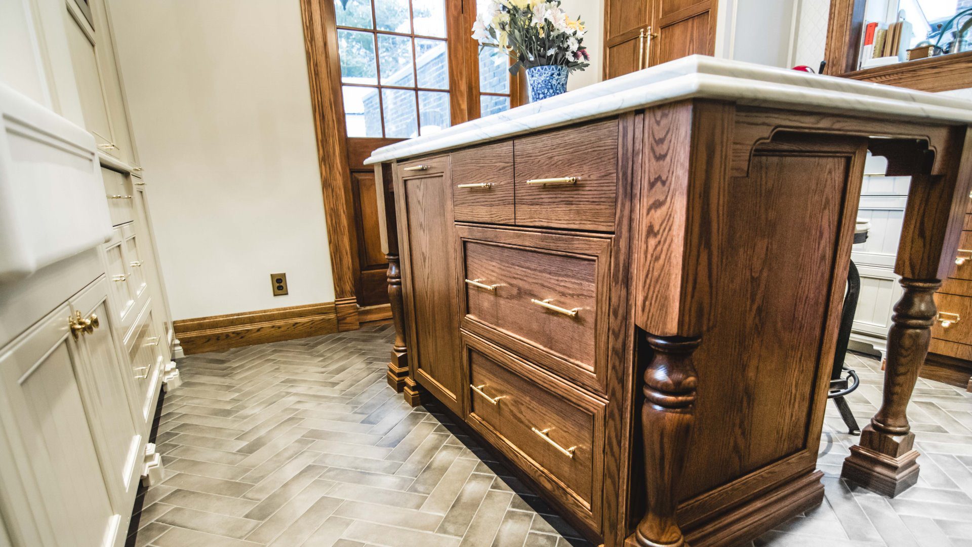 Looking at the huge center island, you'll notice the cabinetry work that was done on the oak kitchen cabinets. The color of the moldings was used as inspiration to apply that same color to the wood. And the result is so similar that you would think the island was made of the same wood. Also note the white lacquered MDF cabinets and drawers work as if they were made of paneling. This material was also used to create the beautiful valances above the windows. All of this was matched with beautiful double thickness granite countertops finished in double ogee.