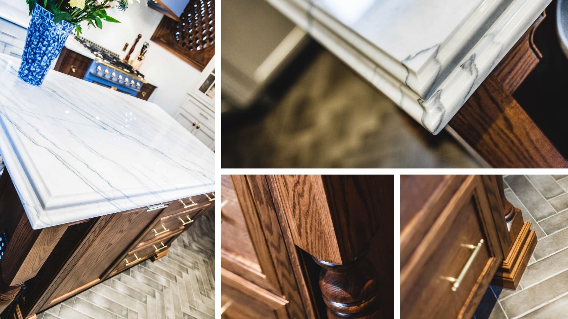 This design concept and material were used to create the beautiful valances above the windows. All of this was matched with handsome, double-thickness granite countertops finished in double ogee. After the focal point, there is the centerpiece, and one cannot help but stare in awe at the royal blue La Cornue stove complete with rustic polished brass knobs and trim, matched with a blue-lacquered MDF hood edged with stained oak, a successful ensemble.