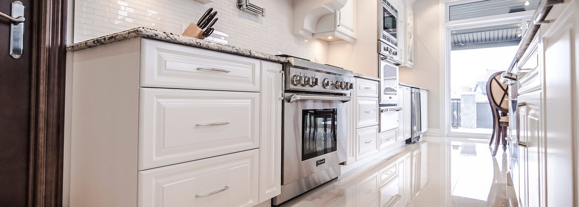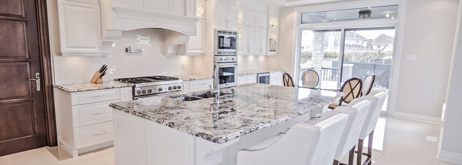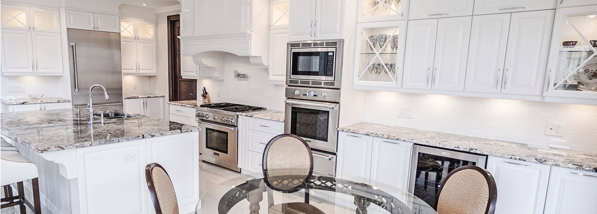 The hand-crafted decorative range hood serves as the focal point, adding a touch of majesty to the fresh and modern take on a classic-style kitchen. The luxurious granite countertops are beautifully balanced by the raised-centre, white-lacquered MDF cabinets, which feature illuminated glass shelves for added elegance.