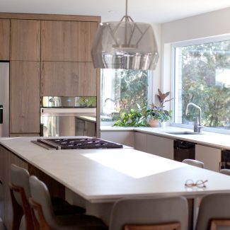 A contemporary kitchen includes a balanced mix of natural materials for a chic and timeless ambiance. Among these, marble, quartz and raw wood are must-haves. Also, cascading countertops and two-tiered surfaces will add a touch of class and elegance to your space.