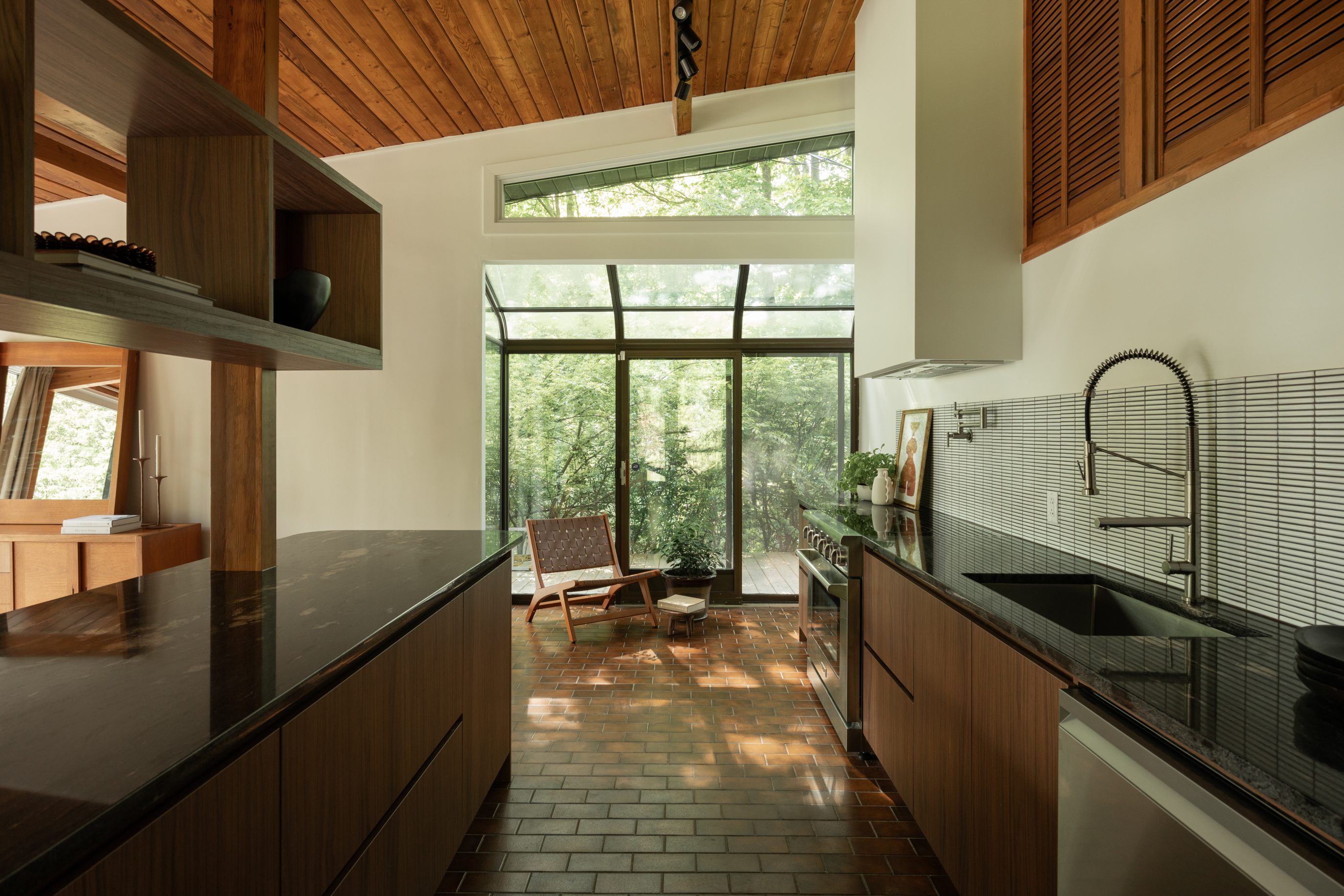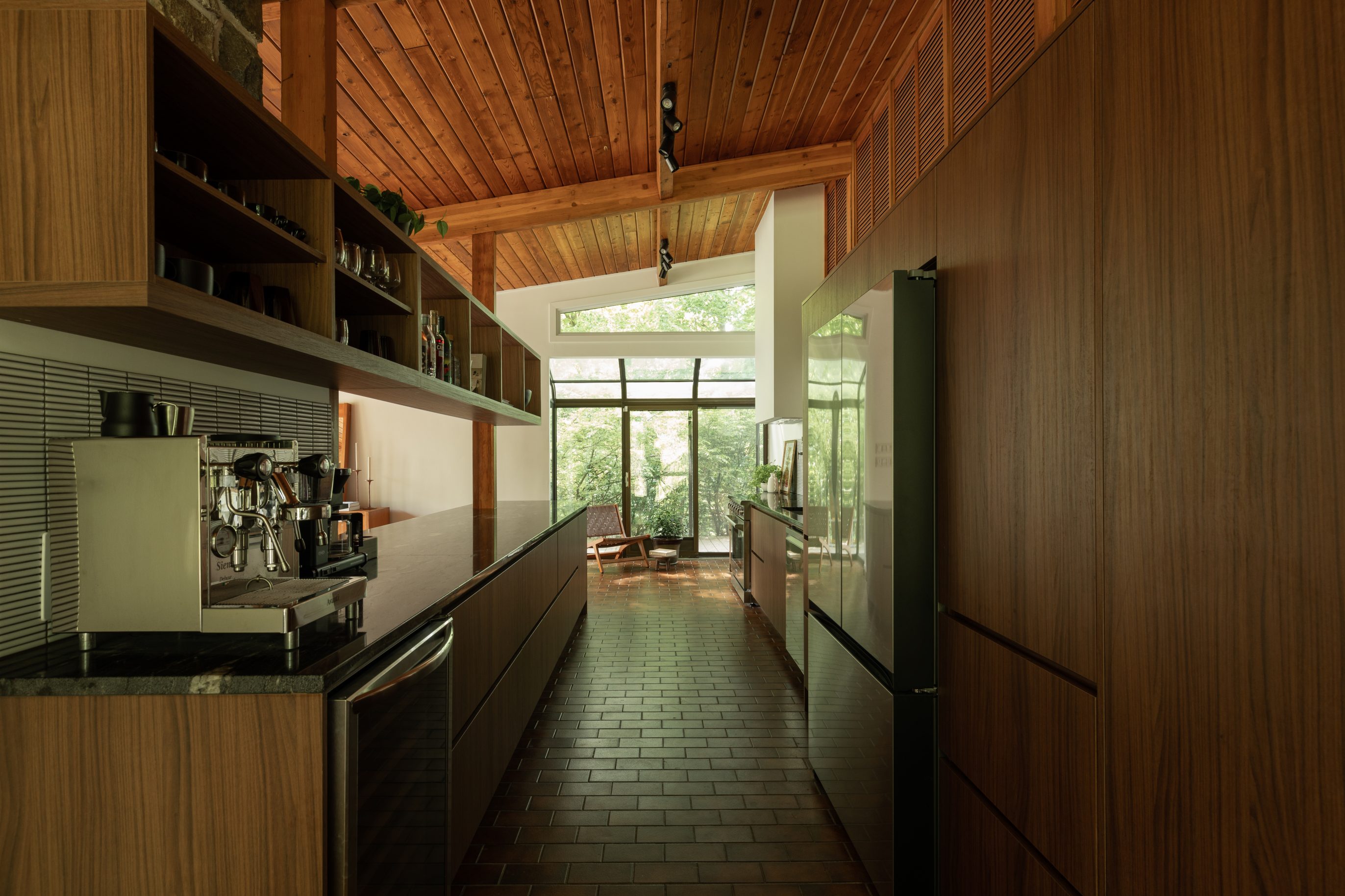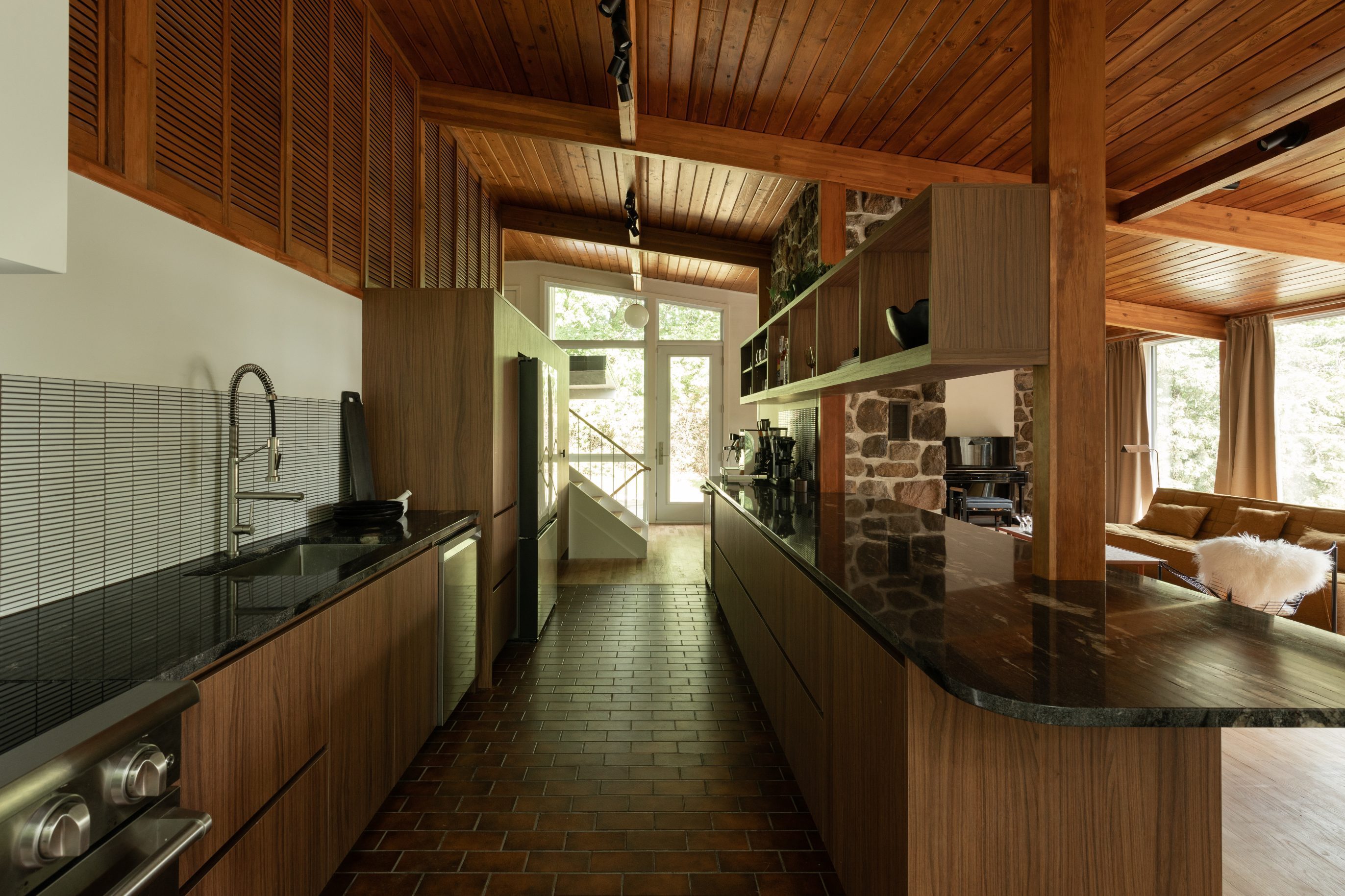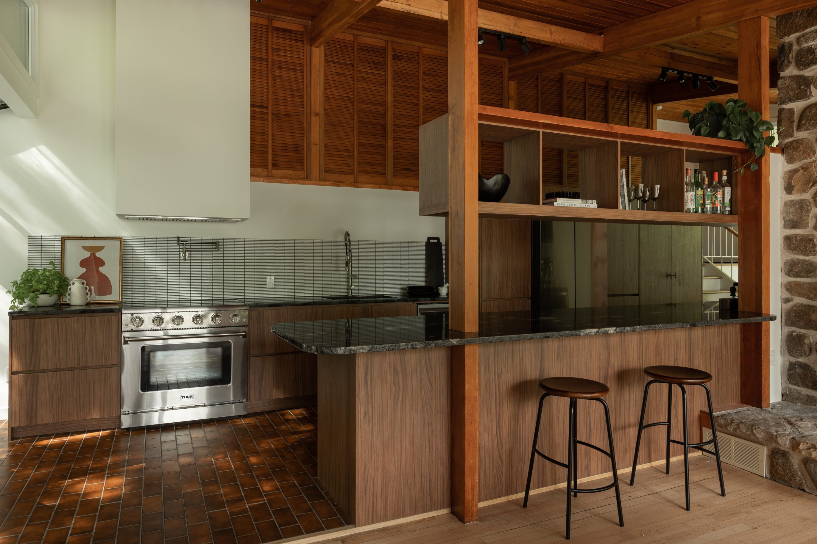 Ateliers Jacob’s “European Laminate” collection perfectly imitates the authentic look and feel of natural wood. It was chosen to custom design the kitchen cabinets and island because it is timeless, durable and easy to maintain, making it the perfect choice for Beatrice and her family, which includes a young child. The “Nogal Victoria” finish was selected to align with the mid-century style of the house.