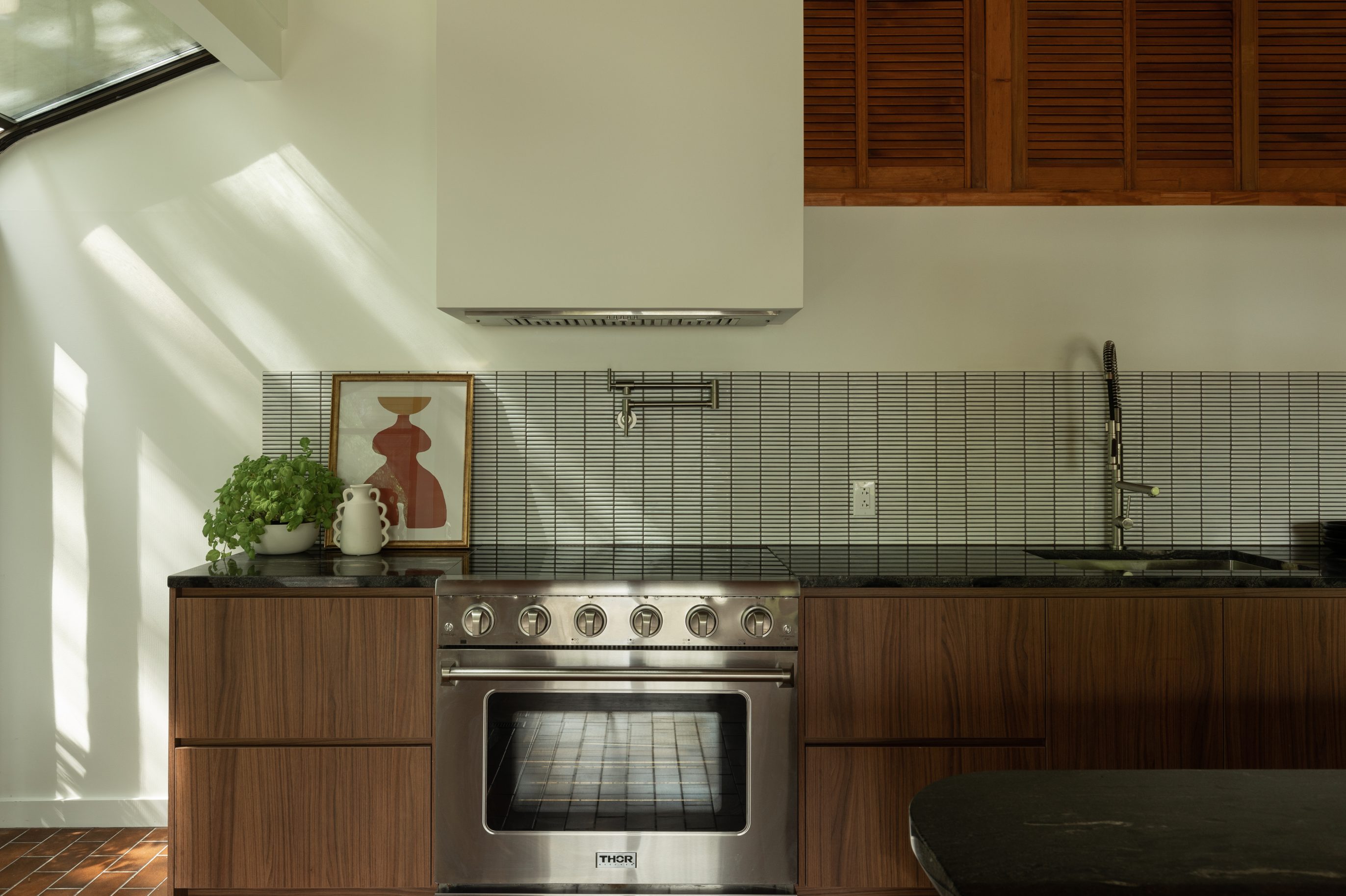 The kitchen’s backsplash pays homage to mid-century style with ultra-thin white tiles and dark grouting. This timeless yet modern design provides a subtle yet textured background that complements the other elements of the room. The dark joints add a delicate contrast that highlights the geometric lines and gives the design more richness and depth to the kitchen.