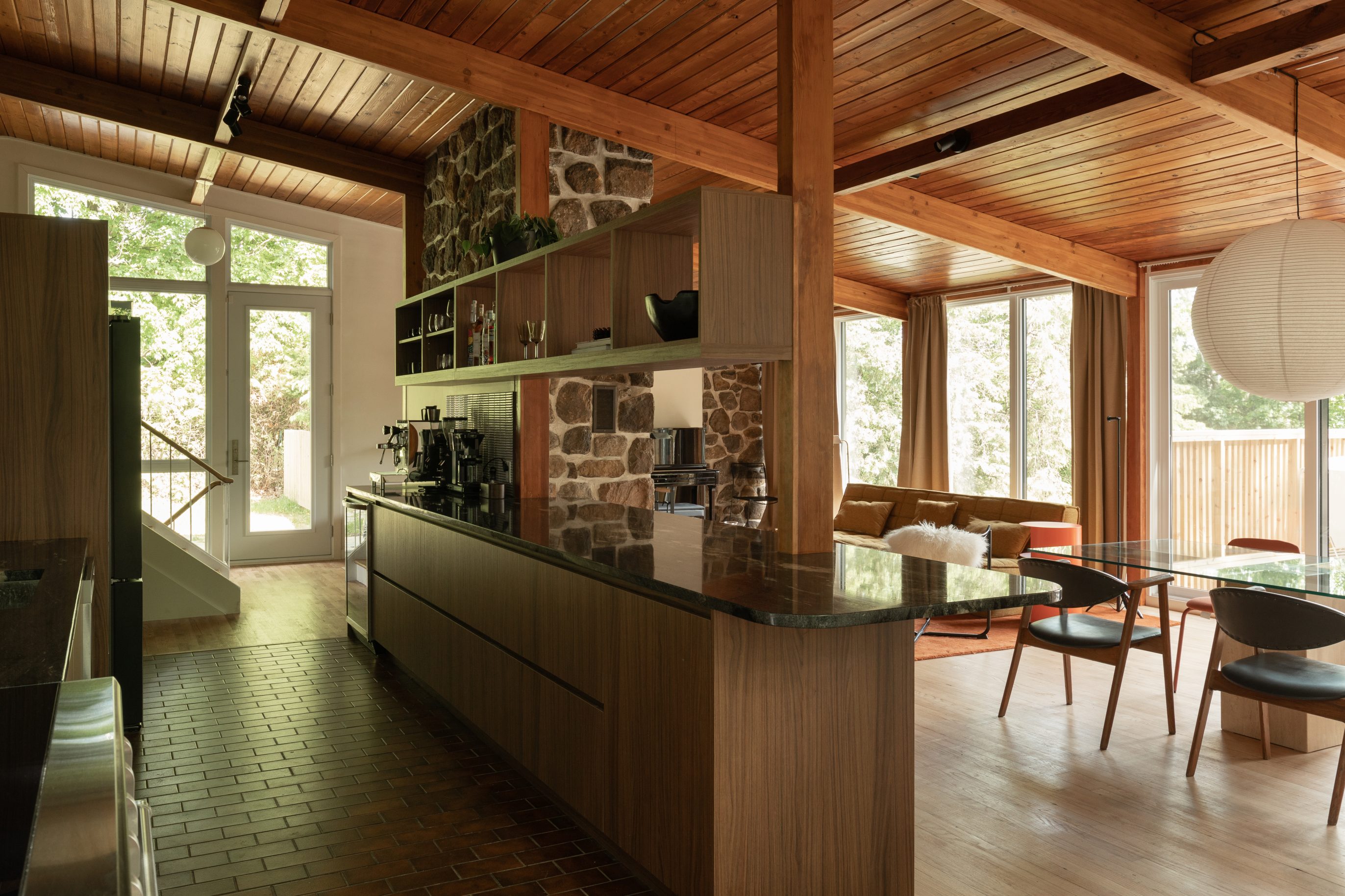 The renovation began with the demolition of the old kitchen. Laurie Bonin-Gohier took the lead in designing a space that harmonizes with the original woodwork of the ceiling, beams, and walls, which were retained to preserve the chalet’s character. Warm brown tones were chosen to highlight these features, creating a cozy and inviting atmosphere.