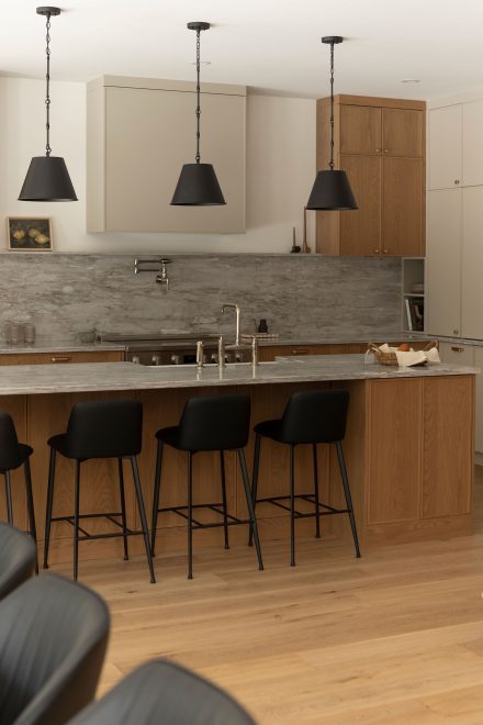 Nestled in the heart of the Laurentians, between mountains and lakes, this home features a contemporary kitchen designed by Ateliers Jacob. Far from the city’s pace, the space unfolds in serene balance where clean lines meet rich materials, creating a contrast between the crispness of the surfaces and the inviting warmth of the wood.