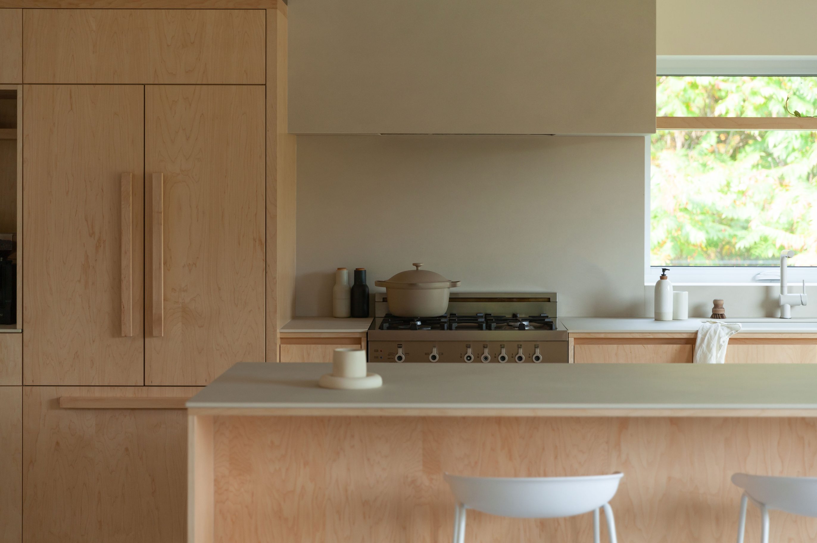 This kitchen is inspired by the “Hollywood” project by Oscar Sainsbury Architects (OSA), located in Smiths Beach on Phillip Island, Australia. Steeped in surf culture, this architechtural approach blends seamlessly into the landscape, allowing light and the beauty of nature to take centre stage. This philosophy inspired every design choice, from the warm maple wood to the ultra-thin Laminam porcelain surfaces, materials that create an airy, weightless aesthetic while offering the durability needed for daily life.