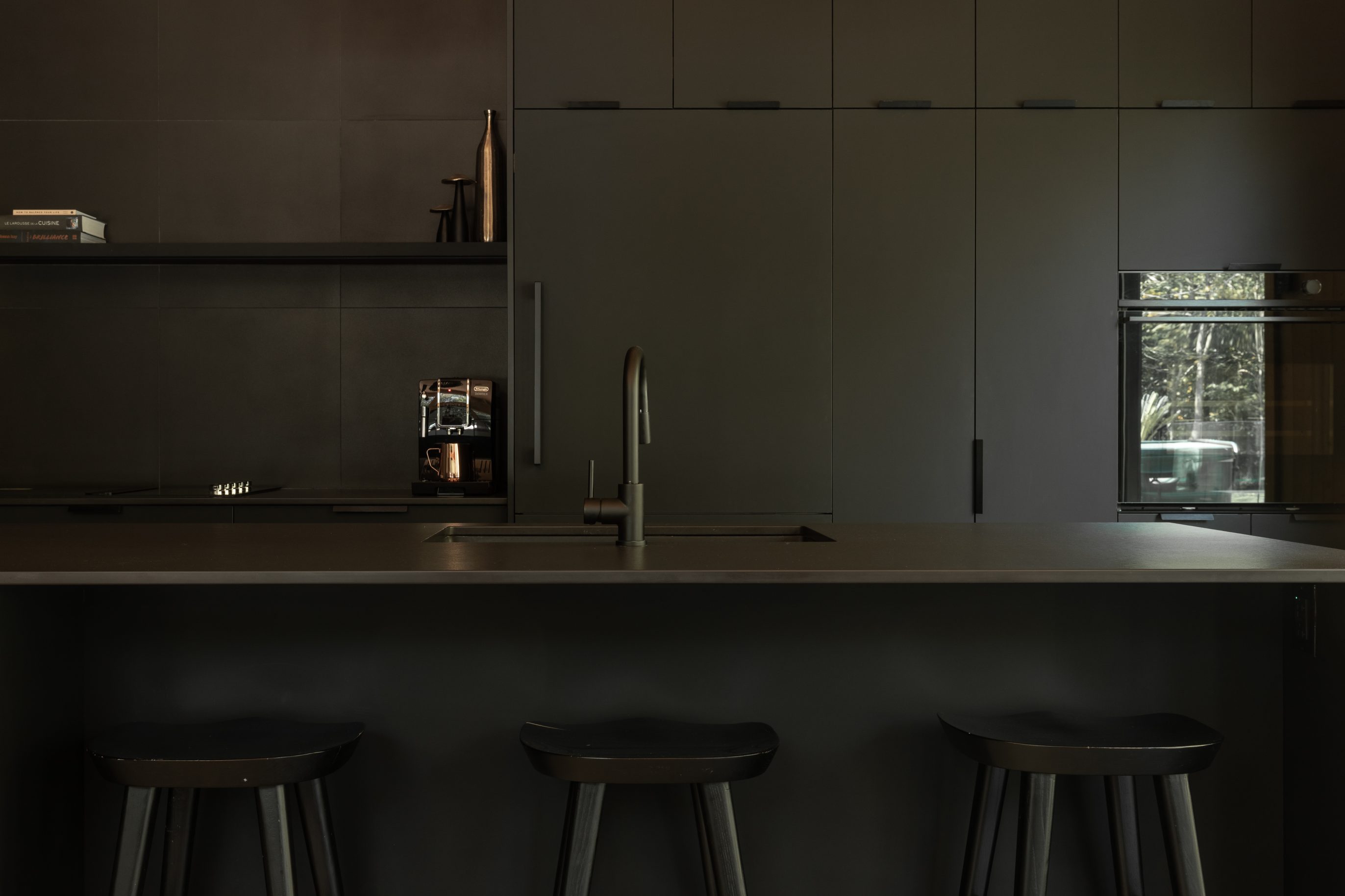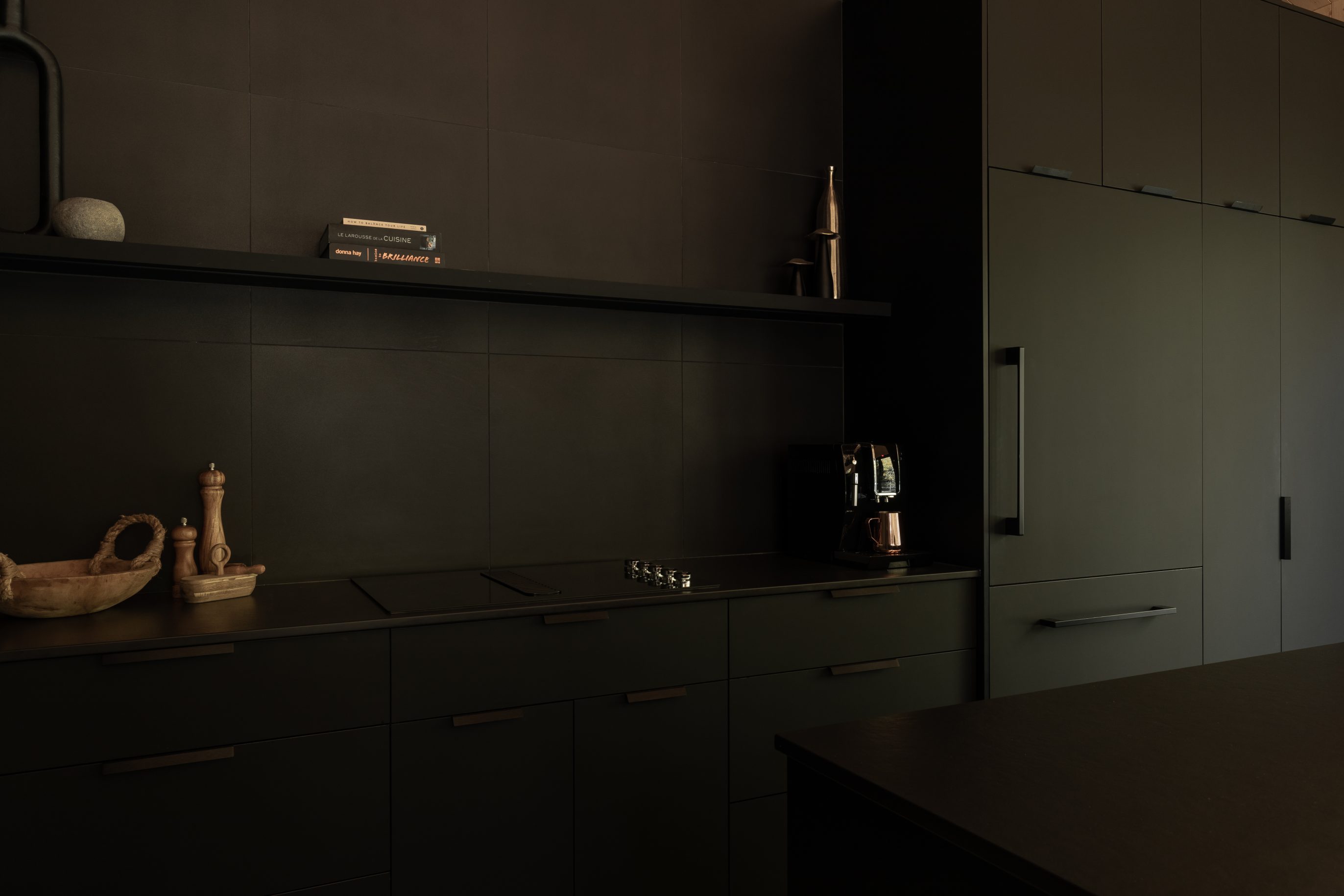 Laurie Campeau, designer at Ateliers Jacob, was entrusted with creating a kitchen that would strike a perfect balance between modernity and comfort while embodying the Zen essence of the project. The idea of a monochrome kitchen, entirely wrapped in deep black and drawing from both Scandinavian and modern influences, quickly took shape. This visual boldness was not designed to impress but rather to soothe. By embracing a palette of rich, dark colours, the kitchen is transforms into a retreat where every detail fades into the background, leaving only the essentials.