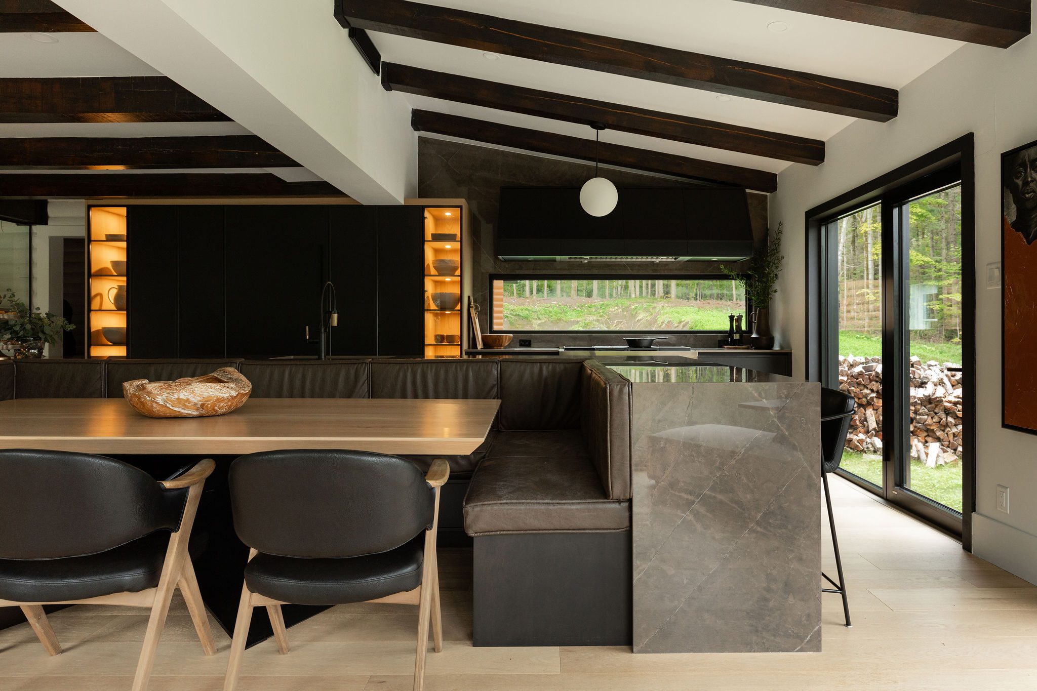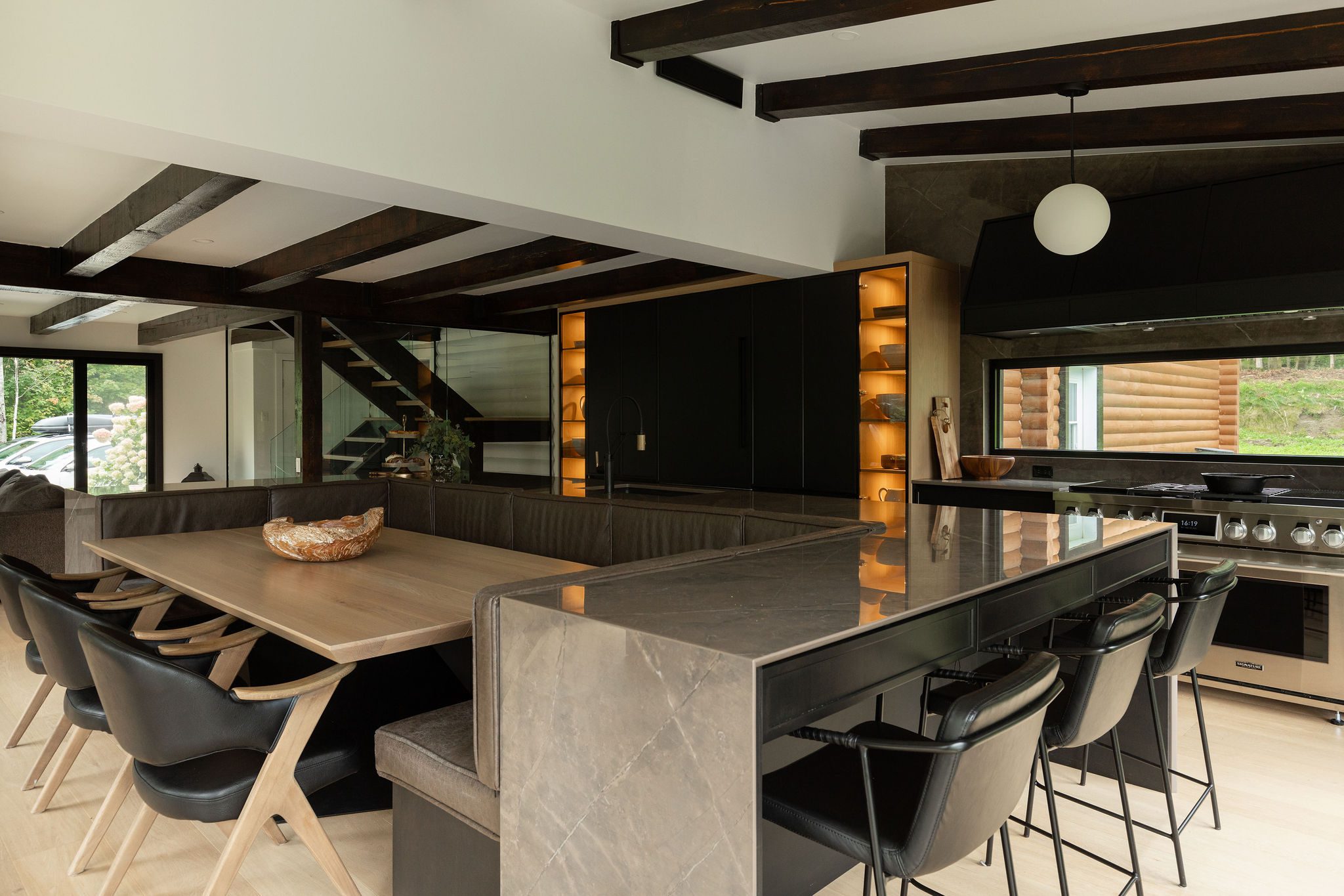 For this project, our vision was clear from the start: to boldly transform a log home with exposed beams and logs into a more contemporary and functional gathering place for family and friends. We were also going to expand the room outward and maximize the windows to bring in as much light as possible and welcome the relaxing view of the forest behind.