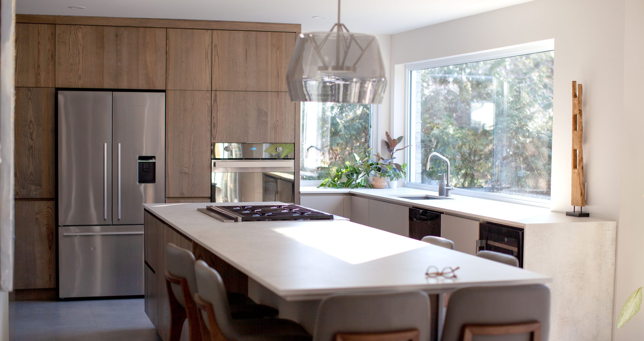 At first glance, it’s the light that impresses. It floods in, streaming through the large windows, gliding across the mineral surfaces, catching the wood grain. The kitchen doesn’t just exist indoors: it responds to its surroundings—the trees outside, the hushed silence of the neighbourhood, the slow pace of daily life.
