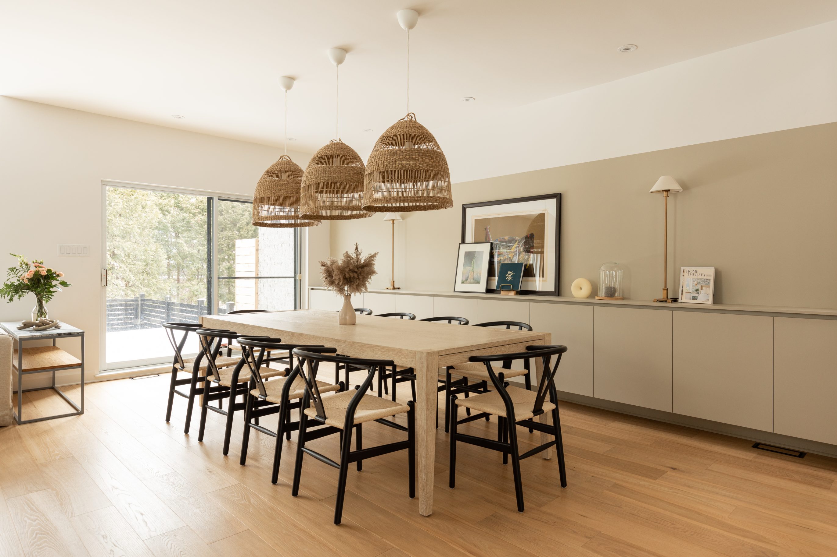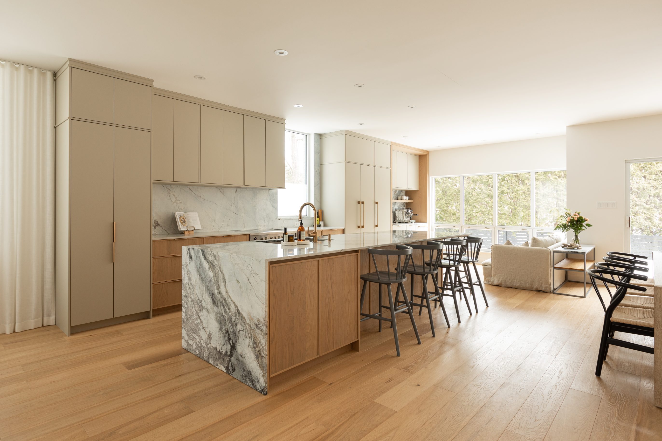 To meet the needs of this family with young children, Ateliers Jacob’s Evoke cabinets were chosen for their ease of maintenance. To add a touch of warmth, Ateliers Jacob’s Wood cabinet collection in stained oak was added to the design. Quartz countertops and a marble island add a natural, vibrant touch to the room. The quartz backsplash was chosen to keep the room uncluttered, while the backsplash in the café area features a darker grain for a touch of character. The wood floor creates an effect of grandeur and continuity throughout the home.