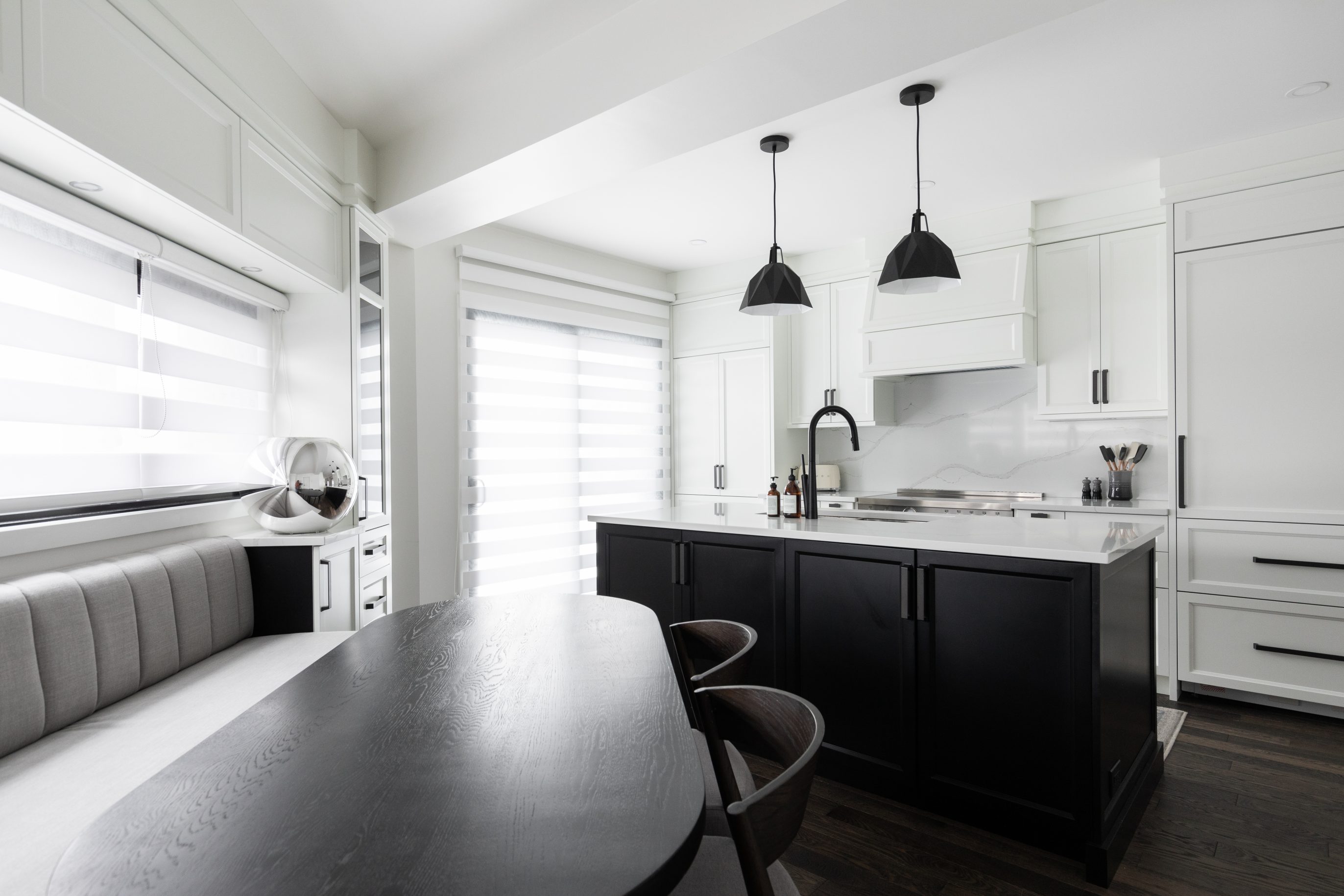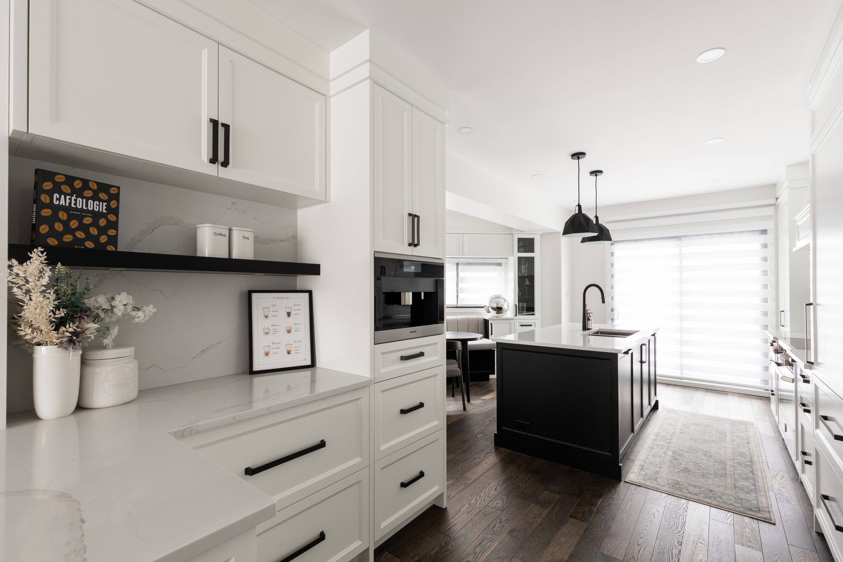 The sleek and serene style of this contemporary kitchen creates a tranquil atmosphere. The combination of MDF and solid wood offers a perfect balance for achieving a distinctive and minimalist look. What sets this design apart is the addition of a seating area, seamlessly integrating the dining room and kitchen.