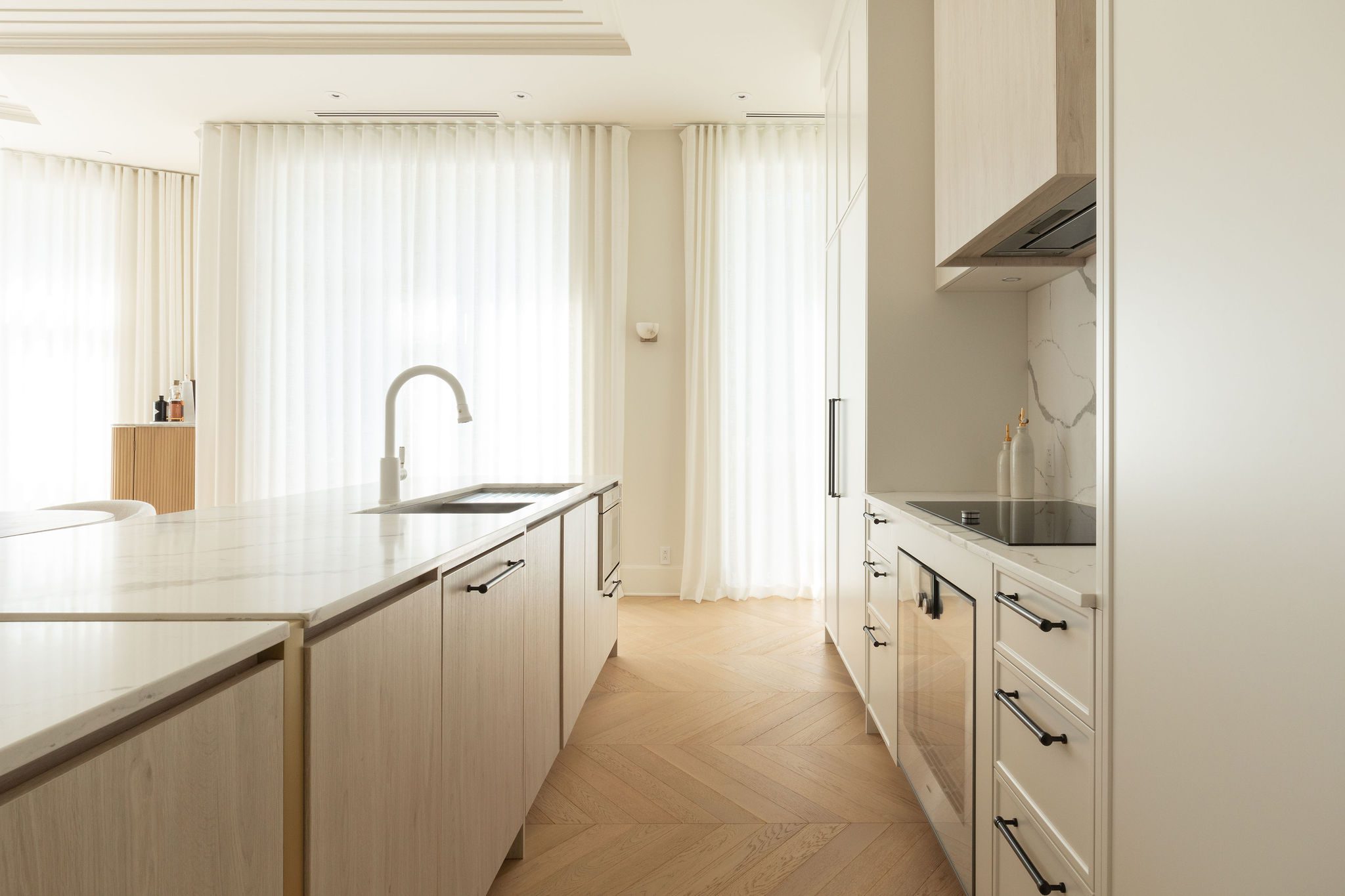 As daylight streams through large windows, it gently caresses Véronique Cloutier’s kitchen, casting a soft glow that enhances the breathtaking view of Mount Royal. This backdrop, seemingly frozen in time, brings with it an air of elegance and architectural charm. Each detail, from the high ceilings to the imposing doors, tells a story of preservation and affection. More than just a kitchen, this space transcends its functional role, evolving into a sanctuary for gathering, sharing, and joy.