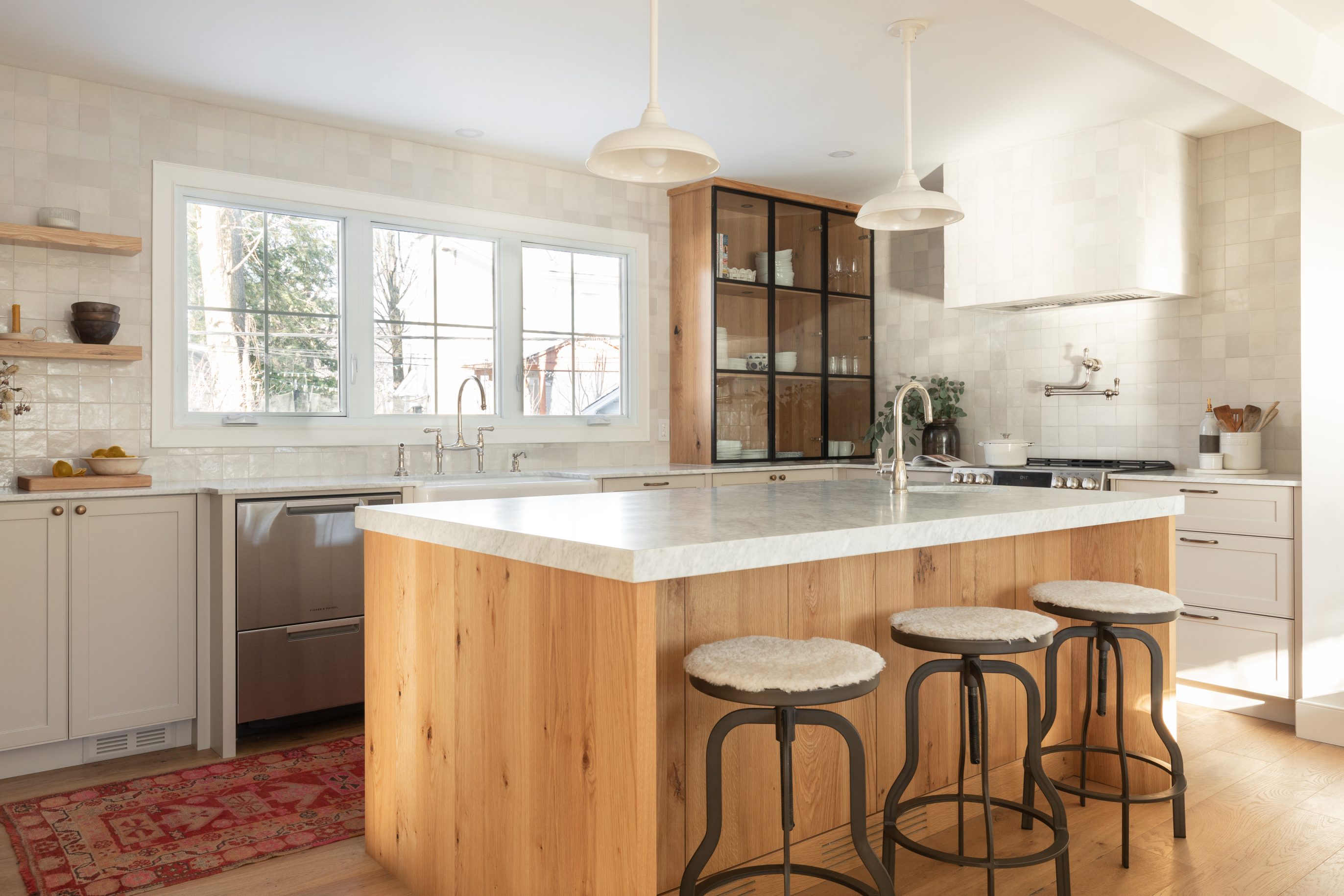 Adding an element of refinement to this kitchen are the glass cabinet doors from Ateliers Jacob. Aged with oak, these custom-made cabinets exude a nostalgic allure and introduce an authentic dimension to the space.