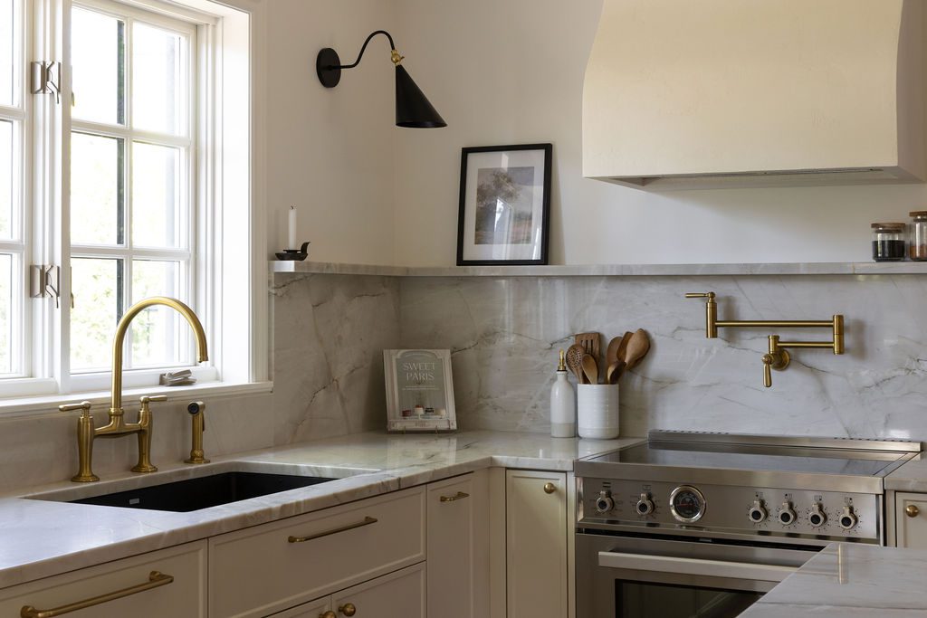 Brass appears like a golden thread, connecting various elements, such as the handles, faucet, utensil holder, and lighting. Its patinated sheen creates a delicate contrast with the natural stone.