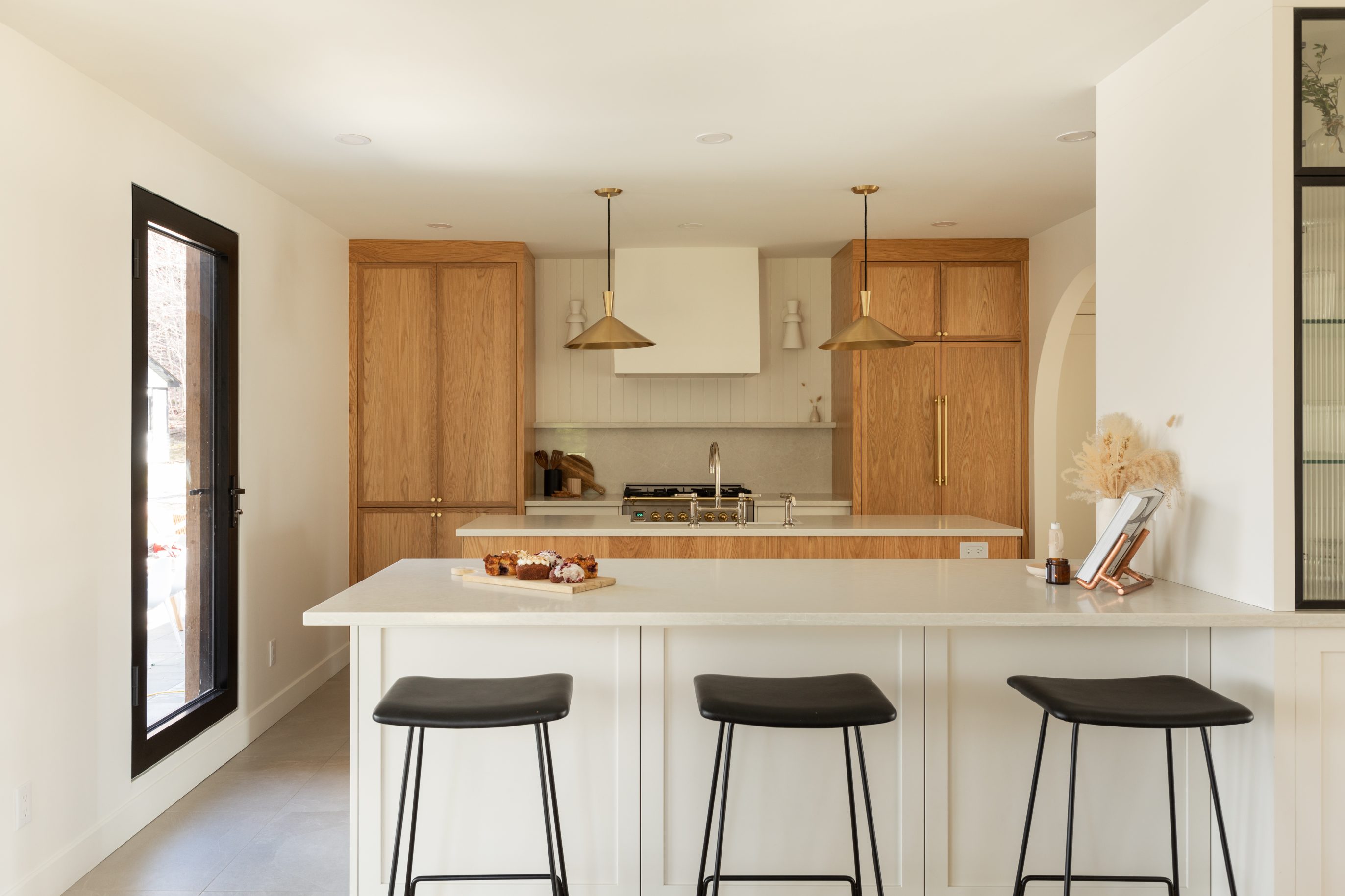 Set back, the main wall showcases clad with natural oak cabinets from Ateliers Jacob’s Bois collection, an embodiment of local expertise and high-end craftsmanship. These cabinets, which extend to the ceiling, discreetly house a refrigerator and ample storage space. Chic brass handles combine elegance and practicality. The wood-toned wall acts as a backdrop that anchors the entire kitchen. It creates an interesting contrast with the custom-made white hood, whose sculptural simplicity floats above a lightly veined stone backsplash, extending the soft tone of the countertop, enhancing the room’s overall harmony.