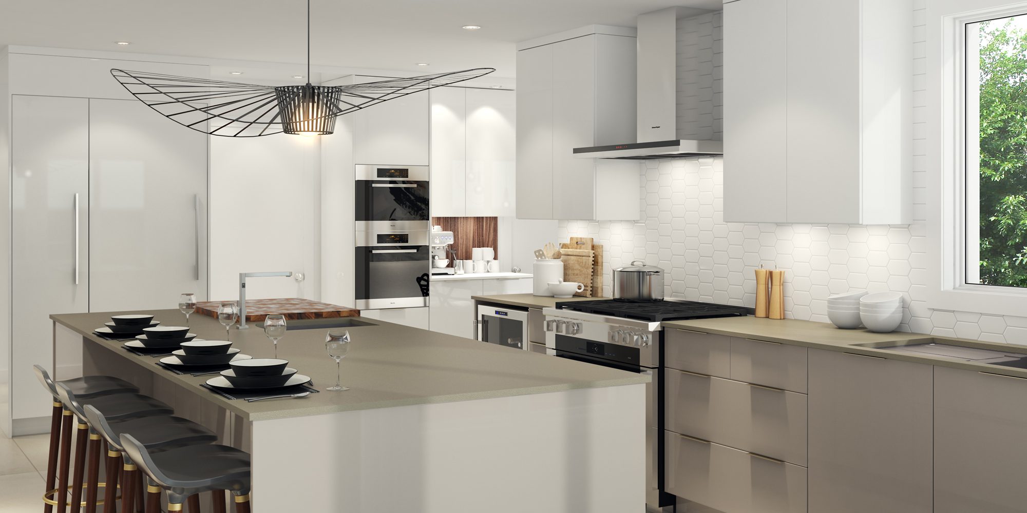 Modern white kitchen with a light-colored countertop and streamlined cabinets.