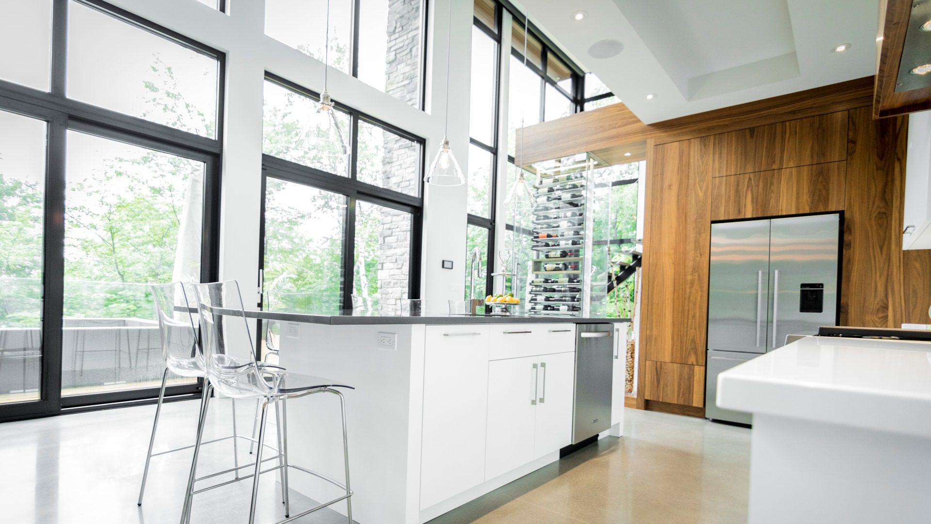 This modern, open concept kitchen is simply sublime. The glass pantry and statuesque window grouping bring another beautiful natural design element, light! Our designs carefully balanced this delightful, ethereal element to give the overall kitchen design brightness and warmth.