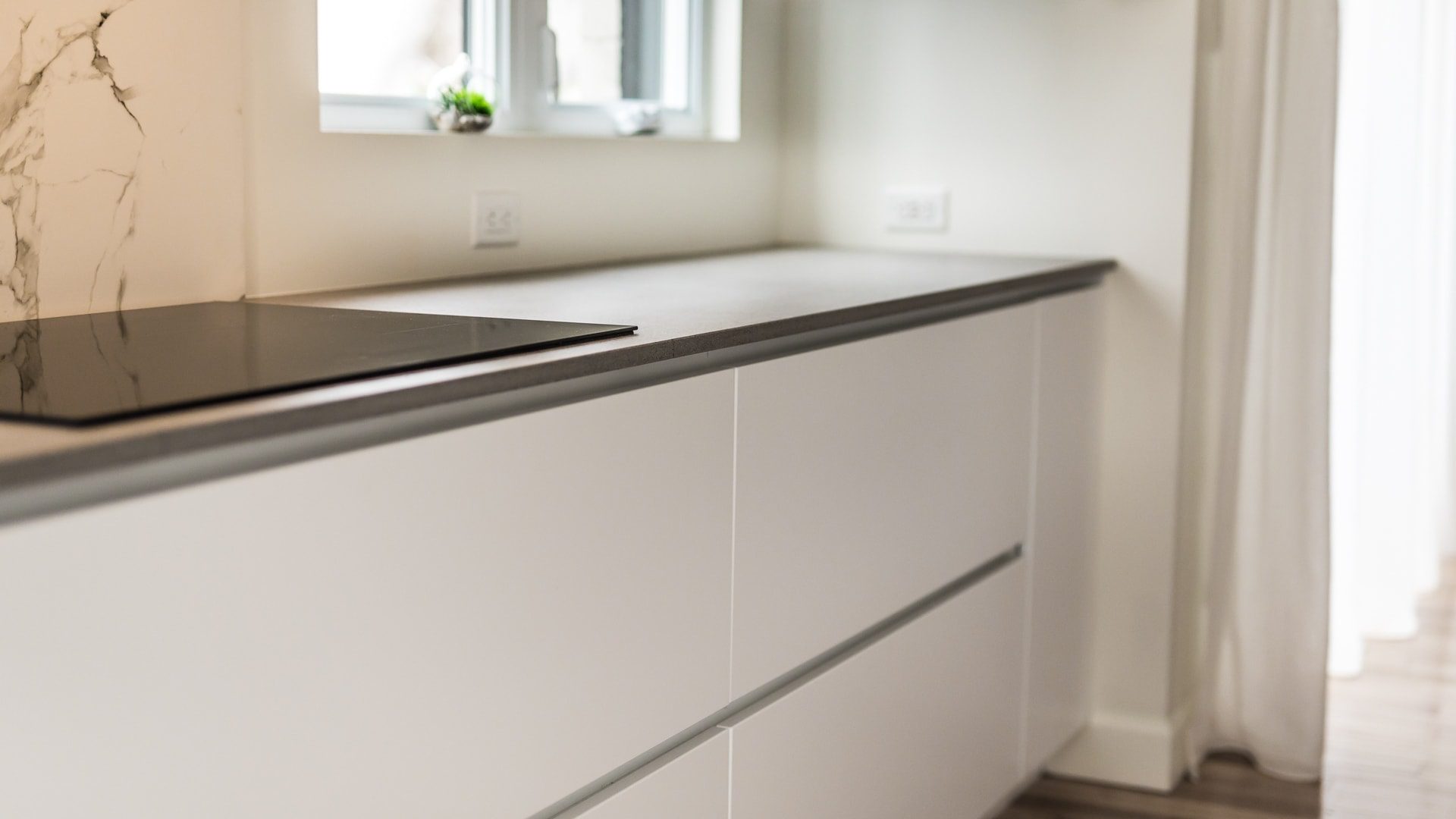 Constructed from Thermoform and melamine, there are numerous kitchen cabinets stacked in this Scandinavian-style room. However, because our designer deliberated on the plans, the room does not feel jammed and overcrowded. Subtle details, such as the absence of handles on the cabinet doors and the use of ”finger grip” systems, facilitate longevity, singularity and harmony throughout the kitchen space.