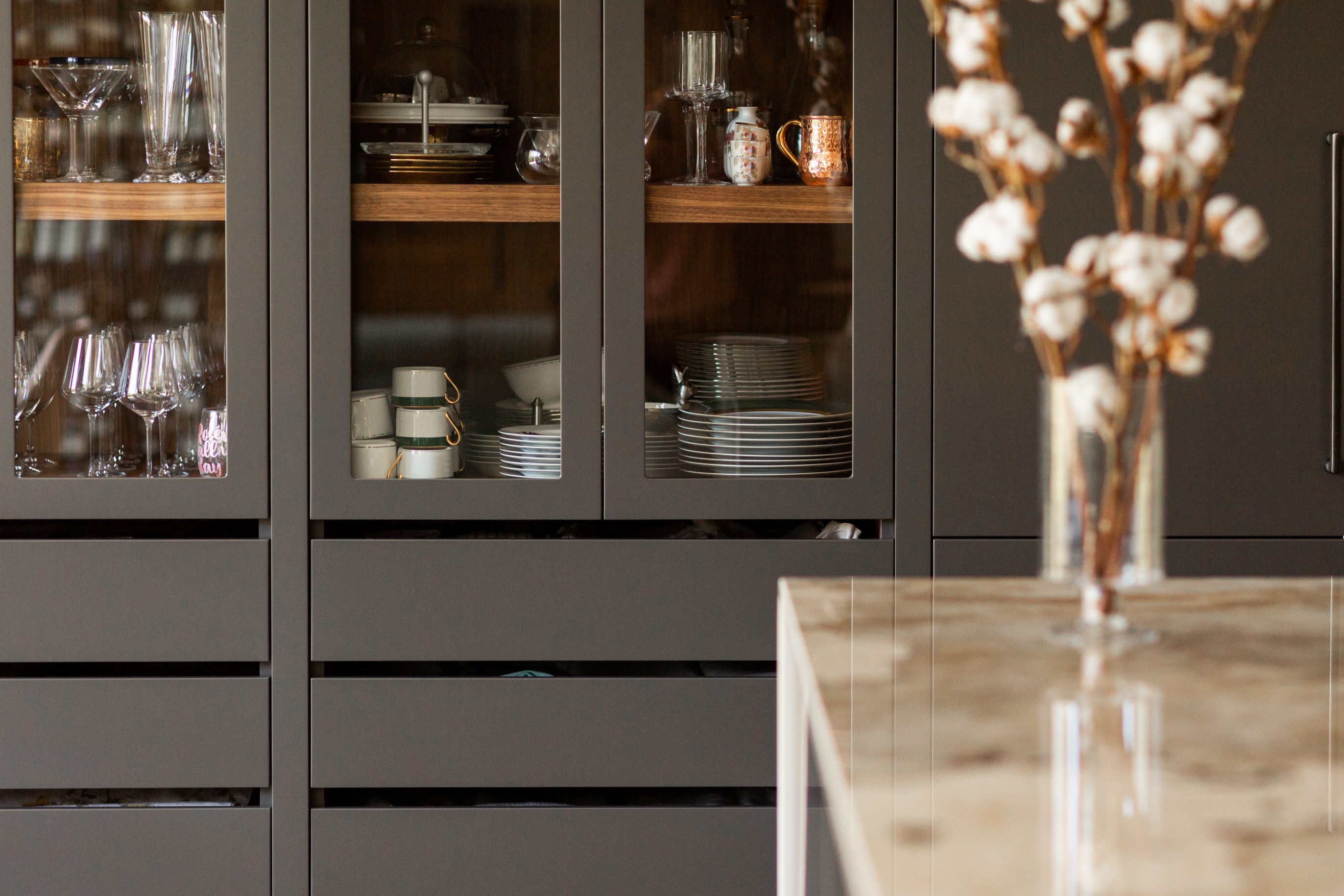 The suede hue chosen for the Evoke collection of wall units and overhead cabinets is soothing and creates a calm atmosphere. The raised pale-coloured cabinets lighten the room and reflect the ambient light. The ultra-matt finishes bring softness to the materials, providing an overall sense of comfort.