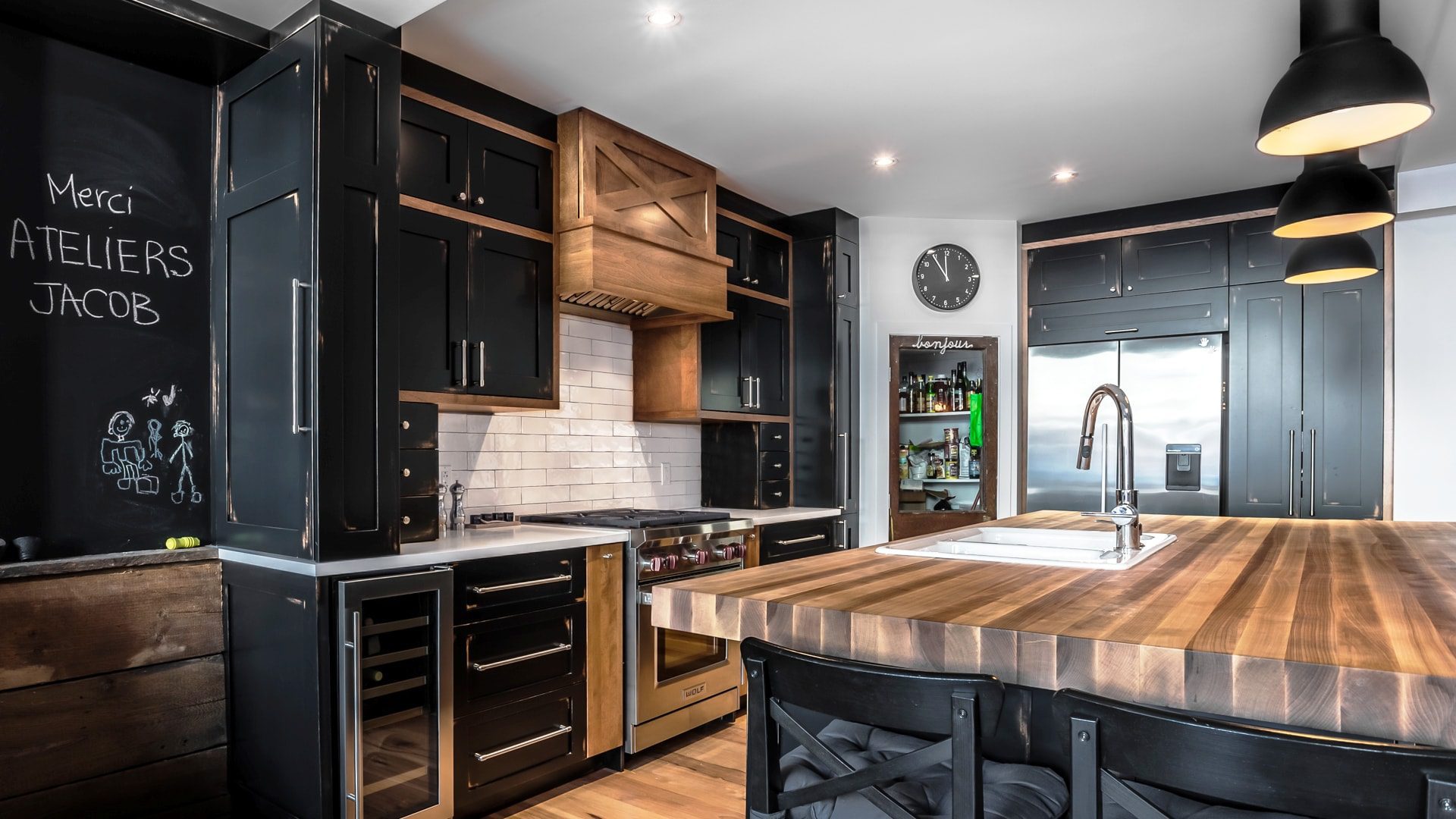 Mariloup worked with our kitchen designer, Evelyne, to bring her vision to life and create an environment that truly reflects her unique style. The result is a beautiful blend of rustic and industrial elements that come together to create a vibrant and welcoming atmosphere. The kitchen cabinets are made of stained birch both inside and out: a staple of our new Ateliers Jacob Collection!